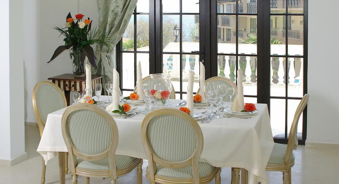 Мы приехали рано утром, заселили нас сразу же. Питание брали сразу трехразовое и ни разу не пожалели об этом. С нами был четырехлетний (уже почти пятилетний) ребенок, которого очень трудно накормить вообще. Но здесь удавалось. Каждый день на обед и на ужин есть супы, меню разнообразное, повар замечательный. В Болгарии, конечно, можно ходить есть в кафе, но отель находится не в самом городе и те, кто был с детьми, все брали трехразовое питание в отеле. Каш не было, но мы это пережили.