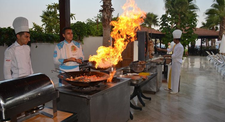 Три года назад отдыхали в соседней 5-ке, питание в этом отеле понравилось больше, чем там. В зале ресторана постоянно находился шеф-повар Turgut, который лично контролировал работу ресторана. Блюда постоянно пополнялись, грязную посуду быстро убирали, тарелок , столовых приборов хватало всем.