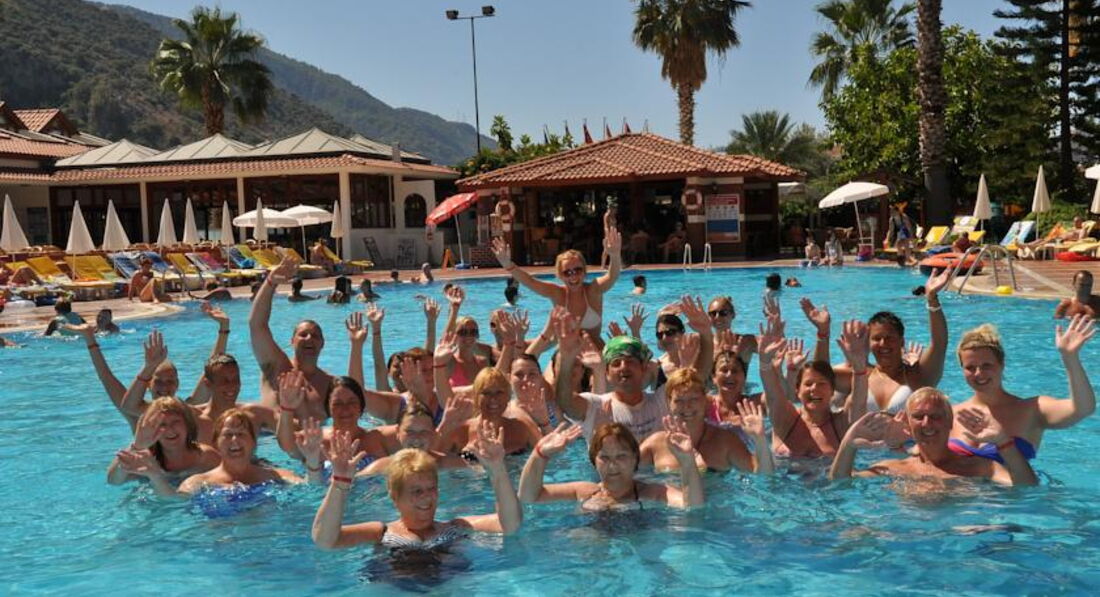 Территория: как я уже писала, все чисто, зелено и красиво. Четыре жилых корпуса и ресепшн расположены вокруг бассейна,замыкают круг бар и снек-бар. Есть детский бассейн и амфитеатр,где проходят вечерние представления. Так же на цокольном этаже главного корпуса находятся фитнес-центр,хамам,массаж,салон красоты,сауна,витамин-бар и еще что-то,не помню... Мы туда не ходили. Т.к. основной контингент отдыхающих-британцы(у Пегаса там только три или четыре комнаты),персонал говорит ТОЛЬКО на английском. но мне моих школьных и институтских знаний хватило,чтобы общаться с персоналом,в магазинах,на пляжах.Анимация тоже на английском,да и на турецком.т.к. турки там тоже есть(забыла про них совсем). Вокруг бассейна англоязычные туристы занимают лежаки часов с 6-ти утра,потом квасятся там целый день,даже в самую жару. Некоторые на пляж и не выползают даже. В бассейне есть горка, работает в определенные часы.