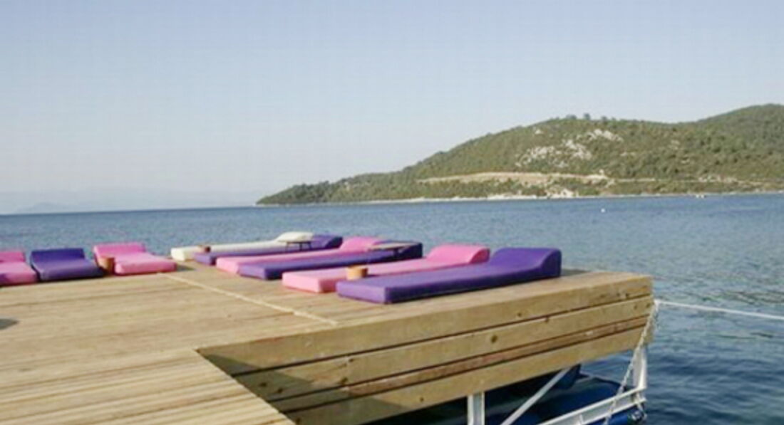 До моря не больше 3 минут по дорожке, вдоль ограждений мини-отельчиков, вокруг цветут кустарники: и глаз радуют, и ароматы источают! Пляжа у отеля нет, но его отсутствие нас не расстроило: есть аккуратный, выкрашенный в белый цвет, понтон. На нем барная стойка, лежаки и подушки фиолетового и розового цветов, зонты. Когда мы отдыхали, места хватало всем, заранее никто с утра лежаки не занимал. В воду можно войти и с берега (галечка с песочком). Вода чистая, в наш приезд была прохладной.