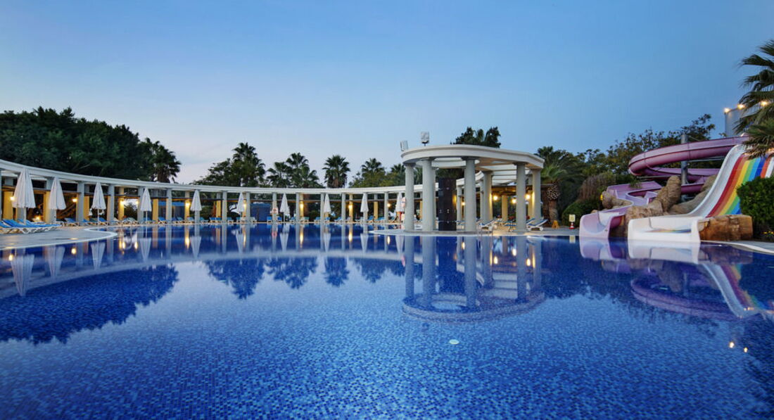 Отдыхали большой компанией 3 семьи: 6 взрослых и 5 детей (10месяцев, 1год, 1,5года, 5лет и 7лет). От Аэропорта до отеля доехали за 30 минут, довольно быстро. При покупки путевок агент, писала комментарии, что мы одна компания и хотим быть все рядом, я сама писала в отель на электронку, в ответ сказали, что сделаем все возможное, НО увы... расселили нас не то чтобы рядом, а в разных частях отеля, территория огромная, конечно мы расстроились, но нашу проблему обещали решить через 2 дня))) так мы и прожили все 14 дне))) Это единственное неудобство, которое было, все остальное СУПЕР!!! Питание очень хорошее, много фруктов (арбуз, черешня, персики, абрикосы, дыня, успели захватить несколько дней клубнику, апельсины, яблоки)всегда, на завтрак, обед и ужин. Рыба, мясо: курица, говядина, баранина, но больше всего меня порадовало Диетический стол: варенное мясо (говядина или курица), варенная рыба, варенные овощи - набираешь, взбиваешь блэндером (который там тоже есть) и кормишь ребенка, которому 1 год, не надо тащить с собой баночки с пюре!УРА! Так же есть детский стол для детей постарше. Вкусно и остро можно пообедать в гриль-баре на пляже, каждый день разное меню. Так же каждый номер имеет право сходить в ресторан Аля-карт, рыбный, турецкий, итальянский и китайский, на территории отеля, Очень все вкусно и много))) Для детей весь день мороженое, по часам сладкая вата, попкорн, сладкие вафли. Пляж огромный, можно лежать на лежаках на песочке, а можно на зеленой травке (актуально у кого маленькие детки, чтобы не наелись песка))) Заход в море мелкая галька,есть пирс, с которого можно нырять))) Так же есть горки, дети и взрослые купаются с них))) Анимация: для детей есть детский клуб, каждый день разные занятия: стряпают пицы, раскрашивают футболки, рисуют песком и много всего. Вечером детская анимация: клоуны, фокусы, акробаты, но и конечно игры и детская дискотека. Для взрослых: волейбол, дартц, стрельба из лука, аква аэробика и т.д, вечером тематическое шоу, конкурсы, живая музыка в баре возле бассейна и дискотека в баре на пляже. Территория ШИКАРНАЯ: гранатовые деревья, апельсиновые деревья, пальмы, много цветов, по территории ползают черепахи, бегают ежики, белки, ползают ящерицы))) Ооо, кстати, в номерах мини-бар пополнялся каждый день: вода, пиво, кола, фанта. Полотенца меняли каждый день, белье за 2 недели поменяли раза 4, полы протерали каждый день. В общем СУПЕР отель, советую всем с детками ехать только туда!))) Обязательно вернусь туда еще)))