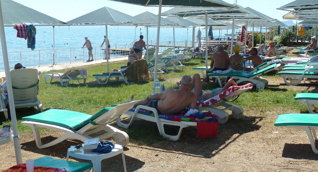 Пляж довольно длинный, шезлонгов много, но вот мест под зонтиками, которые расположены на траве, всем не хватает. Народ занимает места очень рано утром, в половине 8 было уже все занято.