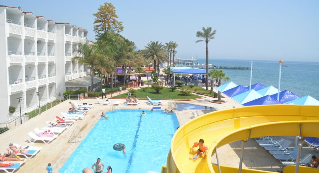 Постараюсь написать подробнее,потому что когда я искала отели, парой отзывы не помогали. Могу сказать фразу "На вкус и цвет....." Так вот, в этот отель мы попали случайно, выбирали совершенно другой, но из-за большой копании в 6 человек, было проблематично улететь нам, поэтому полетели только из-за туда, куда были места. Давайте начнем с заселения. Мы прилетели в аэропорт, отстояли пипец времени на регистрации т.д.(в Анталии мне кажется всегда огромные очереди) чемоданы забрали быстро и вообще не пришлось ждать. В автобус так же быстро сели. Все доброжелательные, помогут подскажут. Жуть как хотели пить, но в автобусе есть очень холодная водичка,мы покупали 2 воды 0,5 за 1$. Ехать не так долго как до других отелей. Если мне память не изменяет то добирались чуть меньше часа, т.к. мы были в автобусе первые кого заселяли.Сразу же нас отправили на ужин. НО..эта была жесть. все салаты были просто окружены мошками (слава богу это было 1 и единственный рас, когда мы видели эту жесть. (совет, приходите первыми на завтрак , обед и ужин) .Номера. Номера просто жесть, душевые и туалеты просто отпадные, все ржавое, мы жили в 4* но ощущение что эта была -3 или ваще 2. Хотя если разобраться, в номерах мы проводили очень мало времени. С кандерами аккуратно, они могут просто вспыхнуть...в 208 номере так и было, а я жила в 207.в 200 номере там новый кандер, в 207 и 208 старые, которые бедалаги уже просто еле работают. Огромнейший плюс-это море в 1 минуту хотьбы. Горки так себе, можно попу просто сшеркать.прокатилась 2 раза и больше не рискнула. Два басика, вода теплая, приятная, не так сильно чувствуется хлорка. Аниматоры отрабатывают на 5+, улыбчивые, разговорчивые, короче просто приятные человеки. И если бы не они, то было бы вообще скучно. После 23:00 там алкоголь платный, дискотека до 00:30, музыка парой хорошая, парой пипец скукота, у нас получилось так, что 90% было рускоязычных ( в том числе и Украина) а 10%,немцы, турки и анличане. Поэтому русской музыки было оочень много и все наши хиты. Если ваши окна выходят к морю и они находятся рядом со сценой, привыкайте слушать ее долго, но ни че, первые дни ее слышно, а потом засыпали не успевая прилечь))) на отдых же прилетели в конце концов, сидите тогда и отдыхайте с основным народам. Экскурсии, наверняка все знают, чтов отеле и на улице, это пипец развод. Можно скататься самостотельно, я конечно не считаю тот момент, когда улететь хотите в Израиль. А вот в аквапарк или подводный мир, пф, автобус 4 лиры до Анталии, и там пешочном погулять, красота, можно покататься на трамваях, они очень крутые в Анталии. Но там система нипель, надо купить карту и толькос ней пройти на трамвай (но нам попалась русскоязычная девушка , местая, и нас просто так пустила на трамвай, но мы ей отдали за проезд, за 4 человека выходит 2 $/ В Кемере делать ваще не ча, только если скататься на рынок, не более того, а вот если захотите погулять по красивым местам, это езжайте прям сразу в Анталию, автобус останавливается прям около отеля, не пожалеете, я до сих пор под впечатлением, слудующий рас обязательно посетим еще Анталию, только другой район. Мы были в порту, гуляли по городу, даже забрели в район, там где вообще не проходят туристы, там на столько все дешево что просто жесть, мы купили колу 0,33 шоколадку маленькую и мороженку, дали 1 $ и нам еще сдачу дали.)) лучше сразу меняйте деньги на лиры, не выго