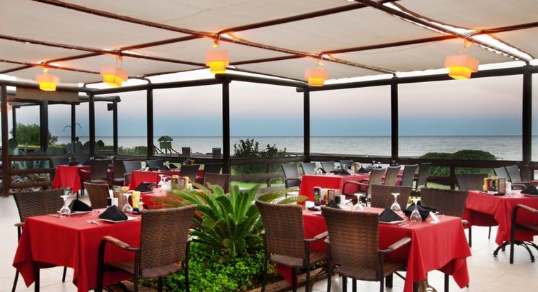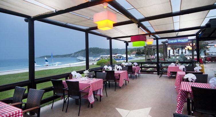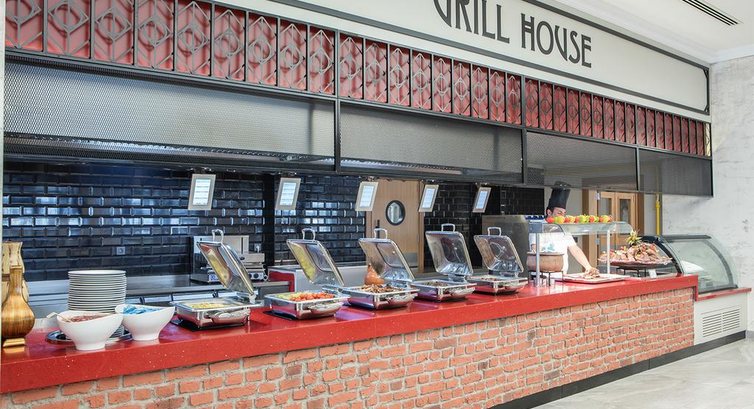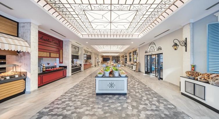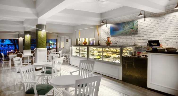 Бари та ресторани: головний ресторан розрахований на 1200 осіб (критий, з кондиціонером, літня тераса, дитяче меню, дієтичне меню, дитячі стільці), бар біля басейну (09:00-00:30), cнек-бар (10:00- 17:00), бар на пляжі (10:00-24:00), турецьке кафе (24 години), Olympos Bistro (10:00-01:00), диско-бар (24:00-03:00), лобі-бар (08:00-24:00), спорт кафе (11:00-18:00), ірландський паб (18:00-01:00). 5 ресторанів A la Carte: італійський, барбекю, мексиканський, рибний, далекосхідний – платно тільки для резервації.