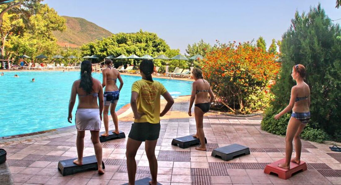 Территория понравилась,то,что отель на горке-даже понравилось-все-таки нагрузка)) ОТДЕЛЬНО СКАЖУ О ТРЕНАЖЕРНОМ ЗАЛЕ-ОН ЖЕ ФИТНЕС-ЦЕНТР-ЕГО НЕТ!!!!! Почему об этом не сказано-непонятно! Но физической активности хватало-море,горы,прогулки) В бассейне купались только раз,выглядит прилично,но вода-не знаю,сколько там хлора)) Уж в море куда лучше.