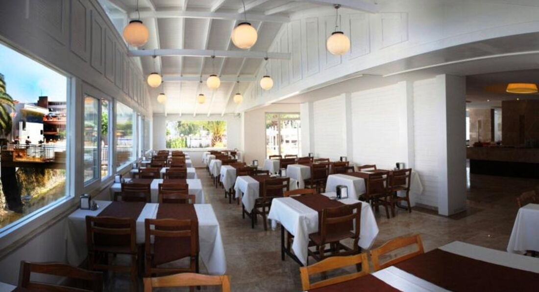 Отель на свои 4+, как заявляет туроператор Пегас, который его продаёт, не тянет. Я бы поставил 3+. Прежде всего подводит питание - оно довольно скудное и однообразное. Настоящего мяса нет вообще, только какие-то котлетки из фарша. Рыбу дают, но она ужасно приготовлена. Выручает курица, её готовят в разных вариантах довольно неплохо. Из фруктов были только яблоки, апельсины и жёсткие абрикосы. С сладостями тоже напряжёнка. Белое, красное, иногда розовое вино наливают из бутылок. Вкус на троечку. Пиво, как обычно в Турции, слабое. Чай, кофе, напитки можно попить из автоматов. Качество нормальное.