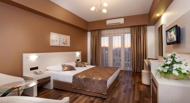 Поселили в семейный номер с 2-мя комнатами. Площадь 45м2. Мебель, сантехника нормальные. ТВ не плазма, но особо и не нужен был, только дети смотрели «Машу и медведь» и «Фиксики» на турецком. Был один какой-то русскоязычный канал и украинский «2+2». В номере чайник, фен, кондиционер. На балконе пластиковые стол и стулья, сушилка. Сейф платный – EUR 2\день. Если ценности демонстративно не оставляете на видном месте, ничего с ними не произойдет, т.к. территория отеля закрытая (вы там даже авто не увидете).