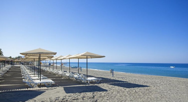 Пляж песчаный, но перед заходом в море идет мелкая галька, поэтому комфортней в спецобуви заходить. Стоит где-то EUR 10. Волны большие были, купаться с детьми далее 5-7 метров от берега было уже сложно.