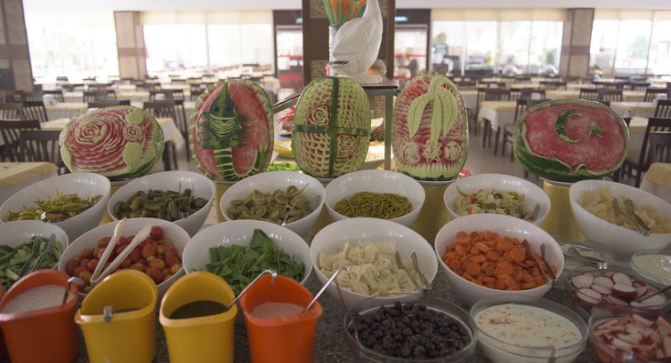 Зайдя в ресторан, мы были впечатлены разнообразием блюд.... было все... салаты, свежие овощи, сыры, колбасы, различные гарниры: макароны, рис, картофель...Мясо: индейка, баранина,курица, говядина... А какие там вкусные супчики...И рыба заслуживает тоже отдельного внимания...Фрукты и стол со сладостями, превосходят все ожидания... Это надо видеть, описать все невозможно!! Мы пока отдыхали, попробовали все: арбузы, дыни( мы никогда таких ни где не ели-сочные, спелые, сладкие), нектарины, черешня, клубника, сливы, персики. Могу сказать одно-и для взрослых и для деток всегда будет, чем порадовать свой желудок! А чего стоят лепешки гезлеме, которые печет женщина возле Бенжамин бара. Они необыкновенные( я их полюбила с картошкой). Тут же рядом айран, течет из крана, самое то, вместо нашего кефира, особенно поутру))) Днем в баре на пляже можете самостоятельно себе сделать гамбургер (наш 6-летка очень любил), съесть картошку фри, пиццу. В Бенджамин Баре-кофе, чай, кексы. Одним словом, голодными не будете!!!