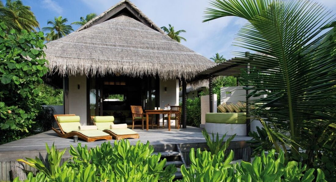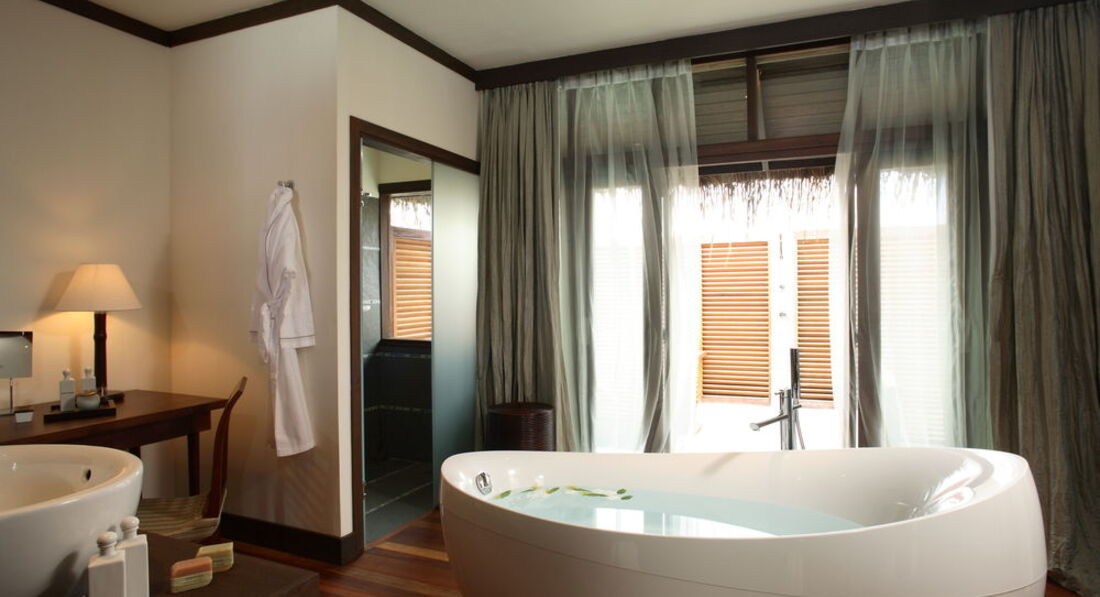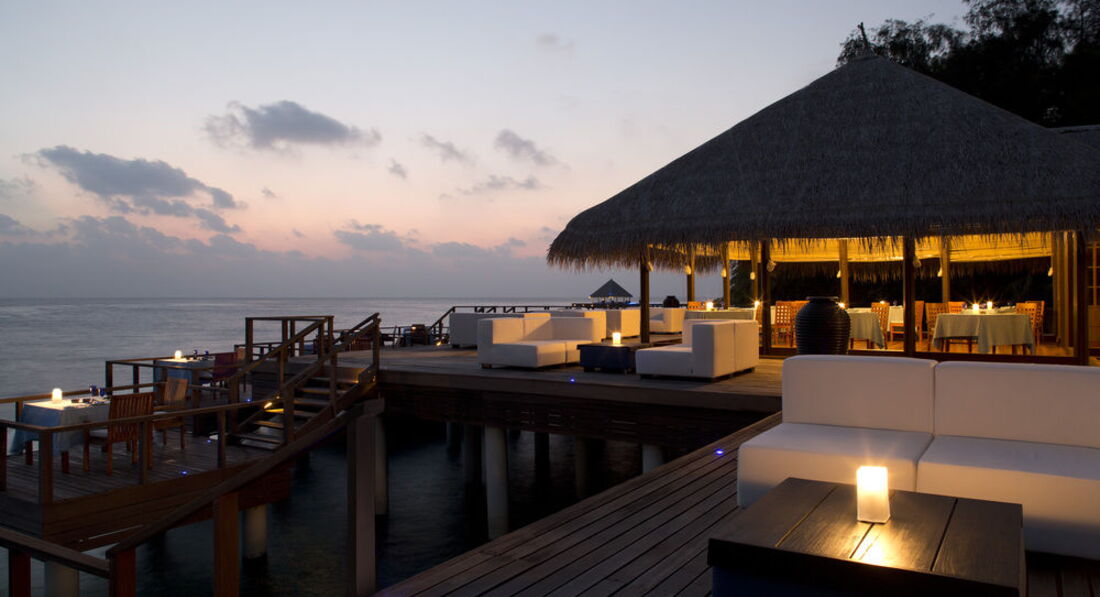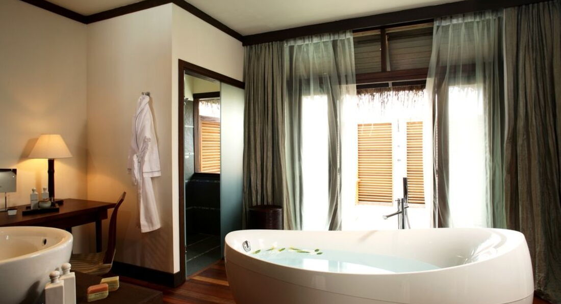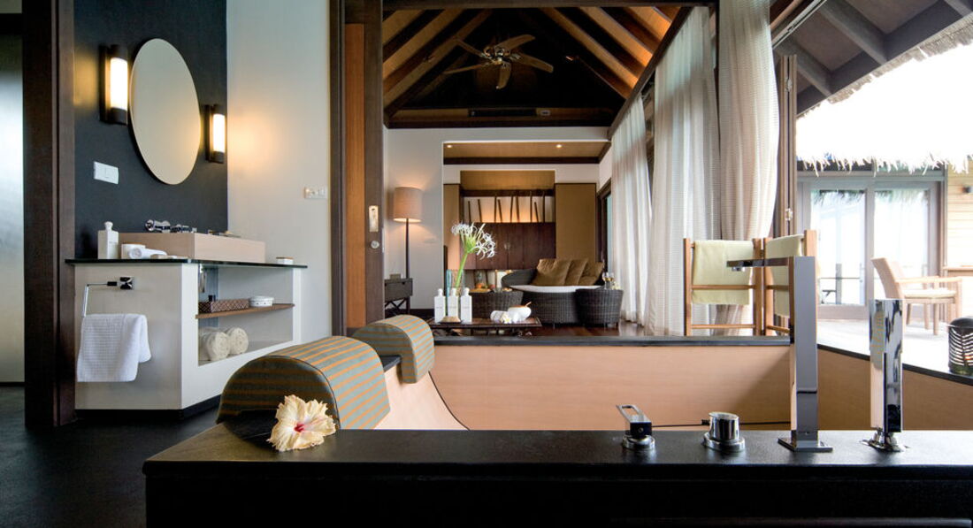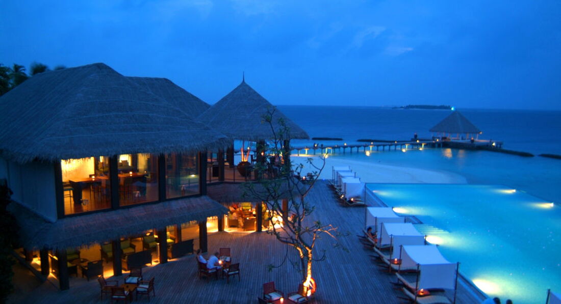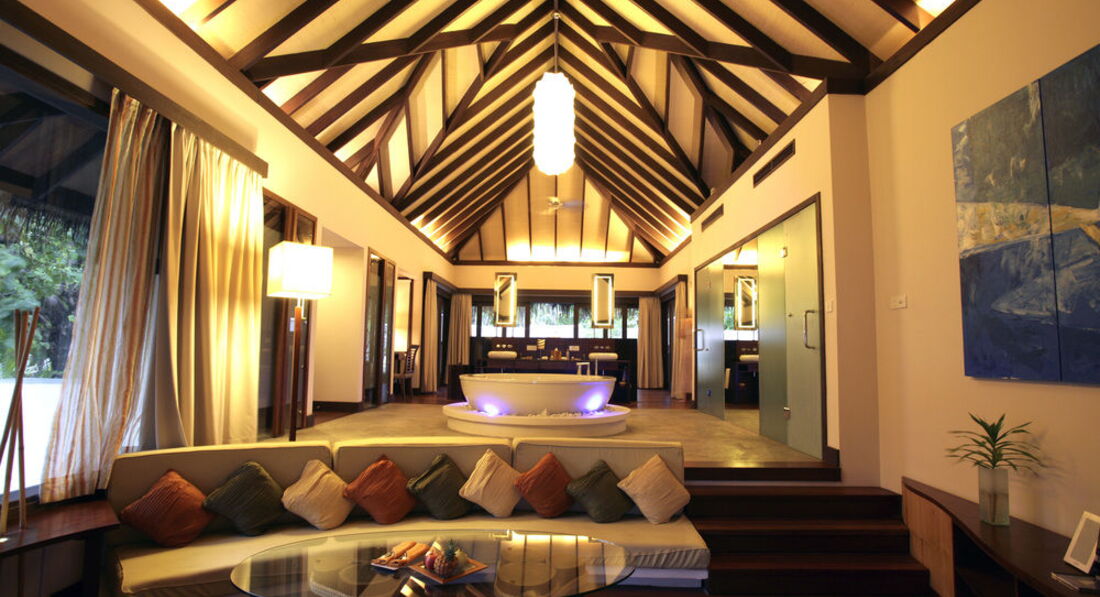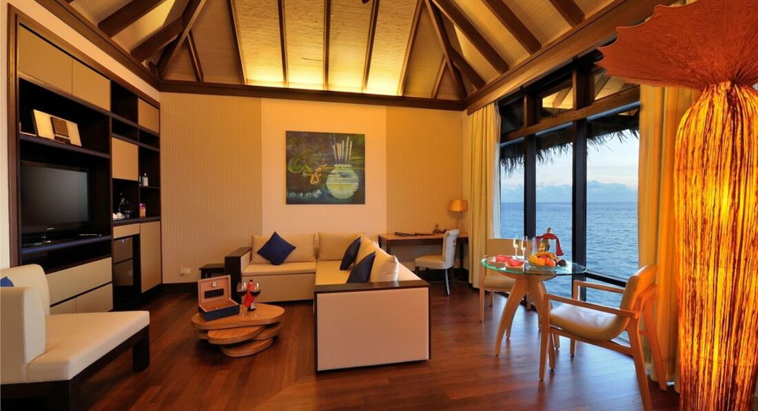 Отдыхал с женой и дочко (7 лет). Перелёт Трансаэро, бизнес-класс. Очень неплохое обслуживание, вылет вовремя, претензий нет. Встретили нормально. Полотенца, прохладительные напитки, новый катер. Через 30 минут на месте. Вилла на берегу. Доступ к морю более-менее. Есть где-то получше, а где-то вообще отсутствует. Была неплохая лагуна, местами глубиной до 3 метров. Большой номер с терассой. Душ в номере и на улице. Тихо. Тем кто ищет уединения - в самый раз. Дорожки из песка, главный бар на песке, нестриженные заросли. Максимальное приближение к дикой природе. Но скучно. Вечером посидеть в приличном, отдаленно цивилизованном (хотя бы полстены и пол из досок) месте не получится. Ipad с максимальным количеством книг и фильмов - альтернативы нет. Развлекушек по минимуму. Наслаждайтесь друг другом. Ну и рыбками. Кухня приемлемая. Убирают вполне прилично. Правда, когда травят москитов (2 раза в неделю), жестко.... Дышать пару часов невозможно, при всех закрытых дверях и окнах. Ну и дизайнерский изыск в виде ванны посреди комнаты удивил. Приятный плюс - свой бассейн, где-то 3х6. В целом - на 4 балла.
