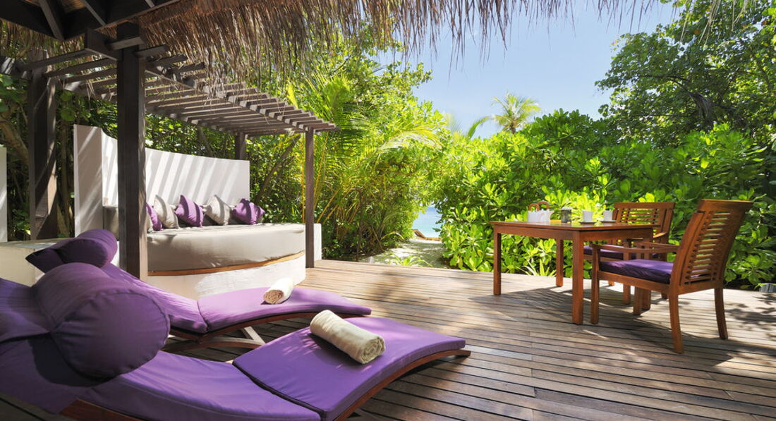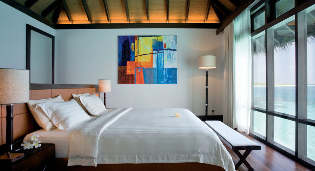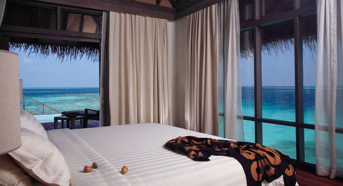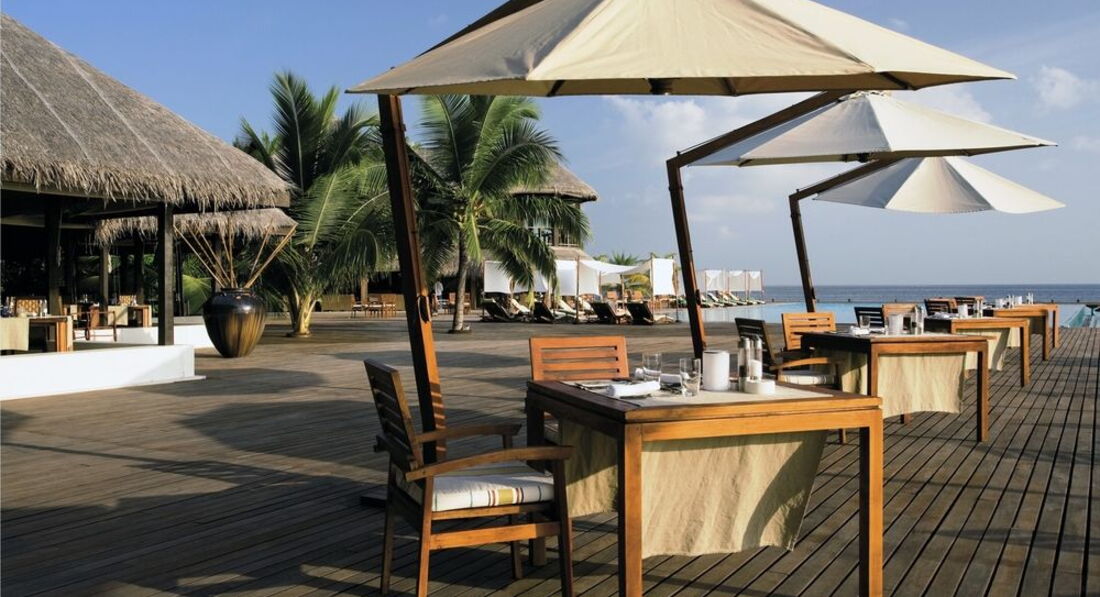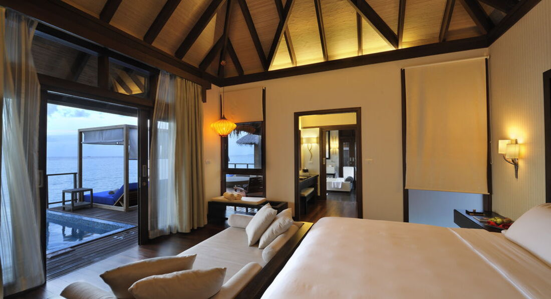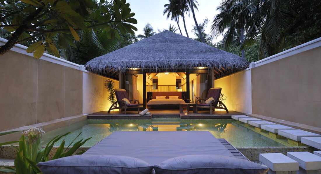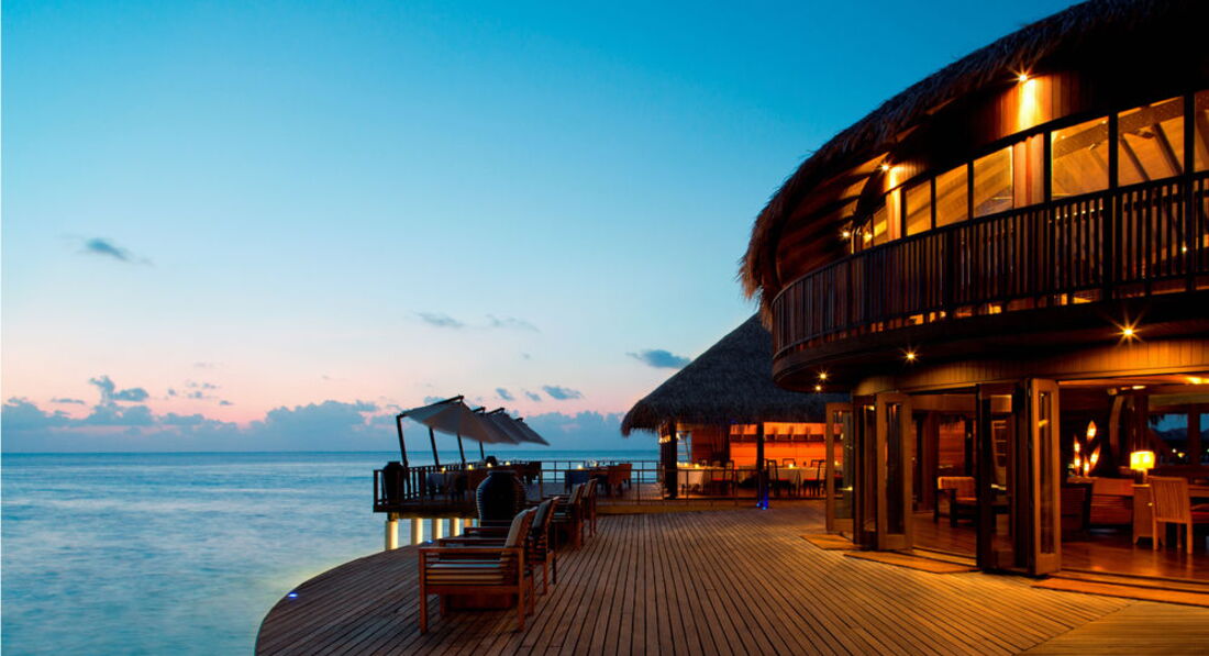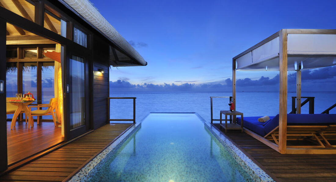 Отдыхал с женой и дочко (7 лет). Перелёт Трансаэро, бизнес-класс. Очень неплохое обслуживание, вылет вовремя, претензий нет. Встретили нормально. Полотенца, прохладительные напитки, новый катер. Через 30 минут на месте. Вилла на берегу. Доступ к морю более-менее. Есть где-то получше, а где-то вообще отсутствует. Была неплохая лагуна, местами глубиной до 3 метров. Большой номер с терассой. Душ в номере и на улице. Тихо. Тем кто ищет уединения - в самый раз. Дорожки из песка, главный бар на песке, нестриженные заросли. Максимальное приближение к дикой природе. Но скучно. Вечером посидеть в приличном, отдаленно цивилизованном (хотя бы полстены и пол из досок) месте не получится. Ipad с максимальным количеством книг и фильмов - альтернативы нет. Развлекушек по минимуму. Наслаждайтесь друг другом. Ну и рыбками. Кухня приемлемая. Убирают вполне прилично. Правда, когда травят москитов (2 раза в неделю), жестко.... Дышать пару часов невозможно, при всех закрытых дверях и окнах. Ну и дизайнерский изыск в виде ванны посреди комнаты удивил. Приятный плюс - свой бассейн, где-то 3х6. В целом - на 4 балла.