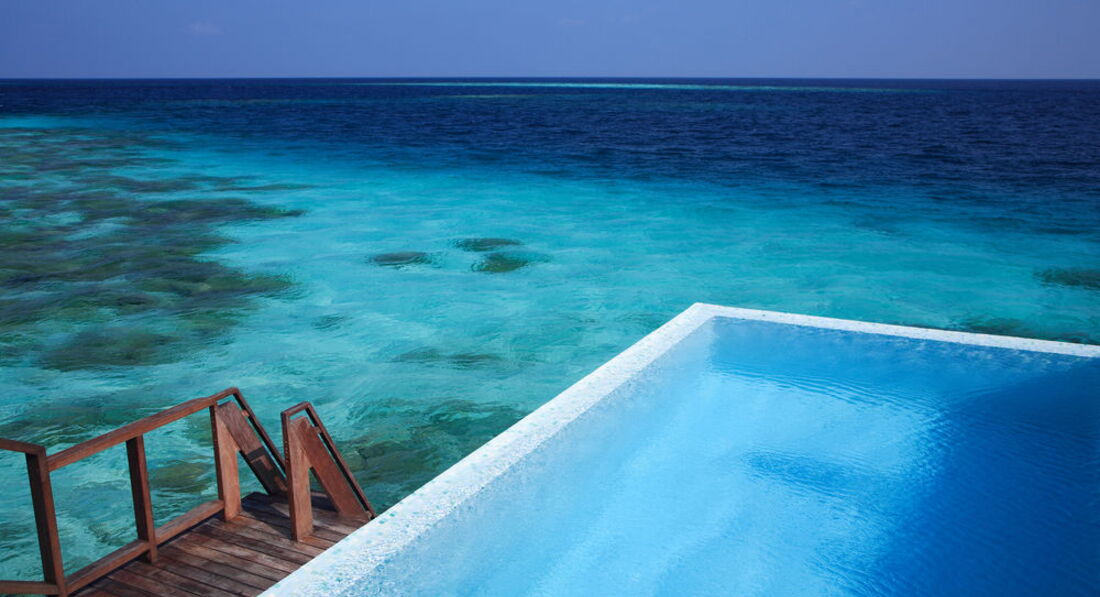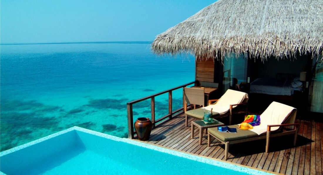 Водные виллы 2х категорий простые и коко палм клаб. Это улучшенные водные виллы, называются ескейп вотер виллы резиденс, с очень хорошим рифом, отдельной территорией, уединенной открытой террасой с