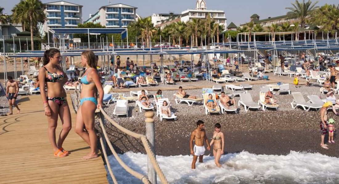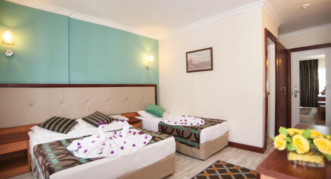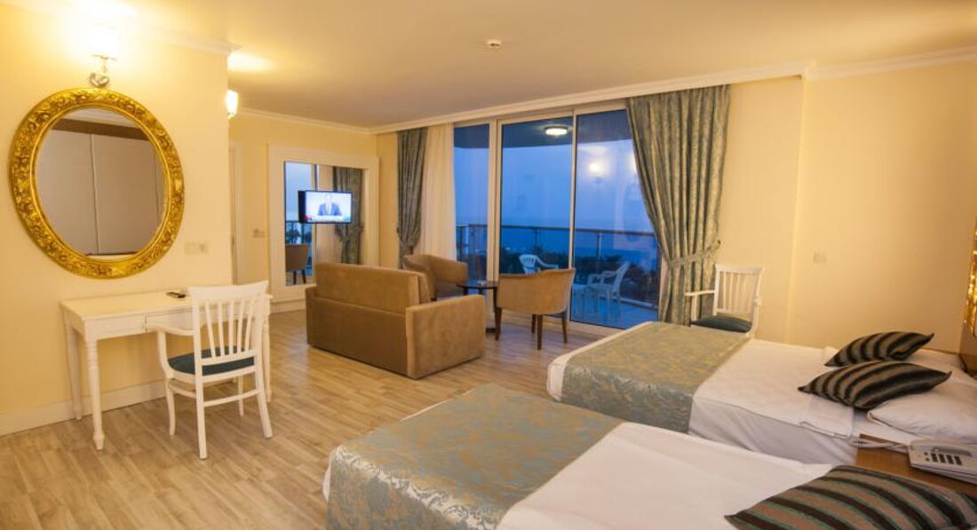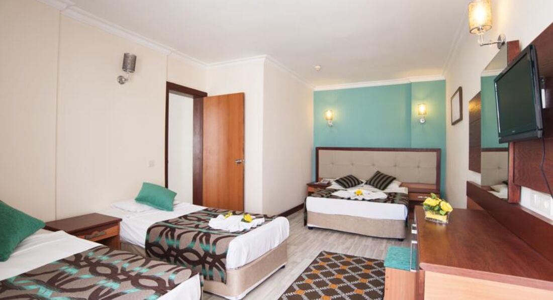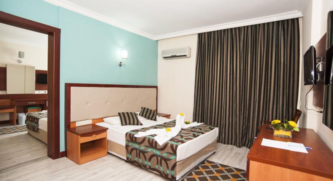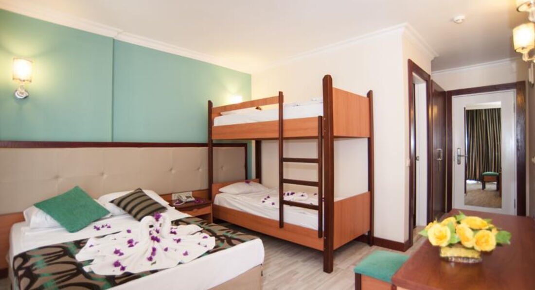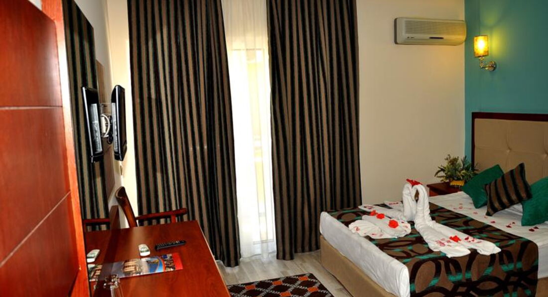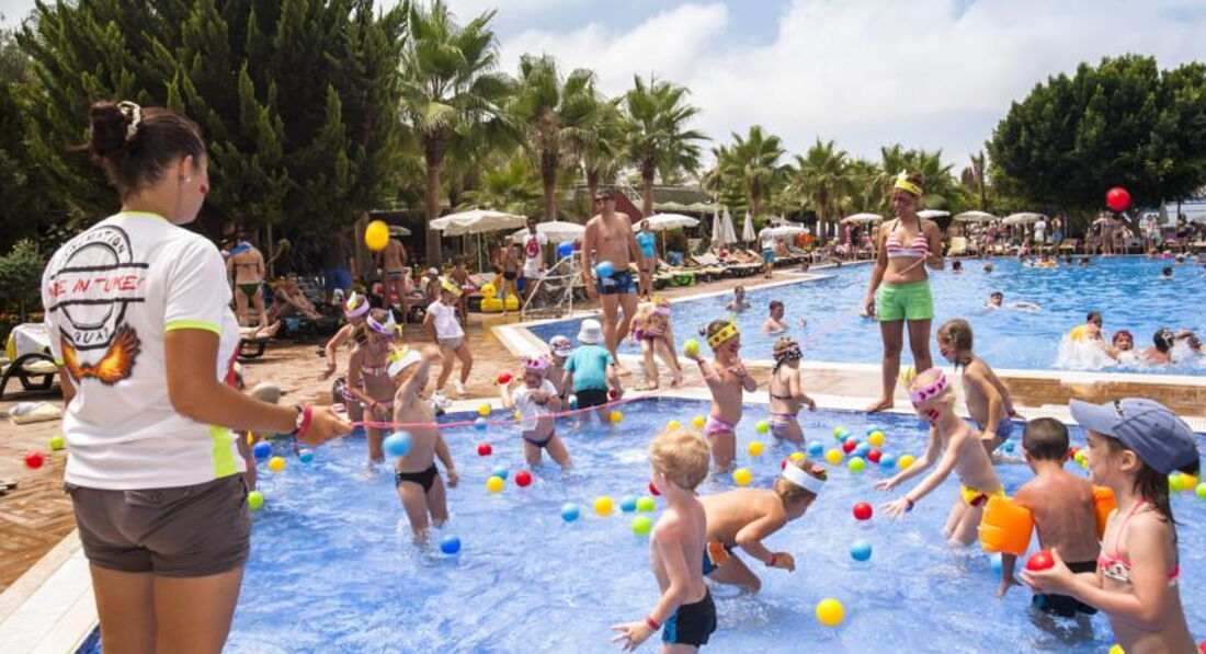 Отдыхали с ребёнком 2,5года в мае 2017, разместили в очень шумном номере, после двух дней хождения на рецепшен, номер поменяли. В номере убирают плохо, пол грязный, даже если оставляешь доллоры всё равно не моют пол. В тихий час с ребёнком поспать не возможно, горничные орут по коридору на своём языке. Детского канала - мультики, нет. Даже в мини клубе для детей мы не разу не видели, чтобы детям показывали мультики. Питание однообразное, острое. Для ребёнка еды почти ( макароны, огурцы) нет. Если жарят вечером мясо на гриле, то надо выстоять очередь из 50 человек, а с ребёнком это нереально. Фрукты были - яблоки, апельсины, грейпфруты и ещё какие-то ягоды жёлтые, не больше сливы по размеру они без вкусные. Один раз давали клубнику по горсточке, два раза арбуз, но это надо выстоять очередь. Можно сходить на базар пешком 30мин. Базар большой всё есть - одежда, сумки, обувь, сладости, фрукты...обязательно торгуйтесь. По дороге на базар увидите ларёк там продают экскурсии, намного дешевле чем вам предложит гид. Море холодное +23*. С детьми купаться невозможно, сразу обрыв. Где стоят лежаки там песок, а у моря и в самом море галька. Нужна обувь для моря. Wi-Fi ОЧЕНЬ медленный и только на рецепшен б/платно. Территория отеля маленькая, негде погулять. На пятёрку отель не тянет. Это 4*.