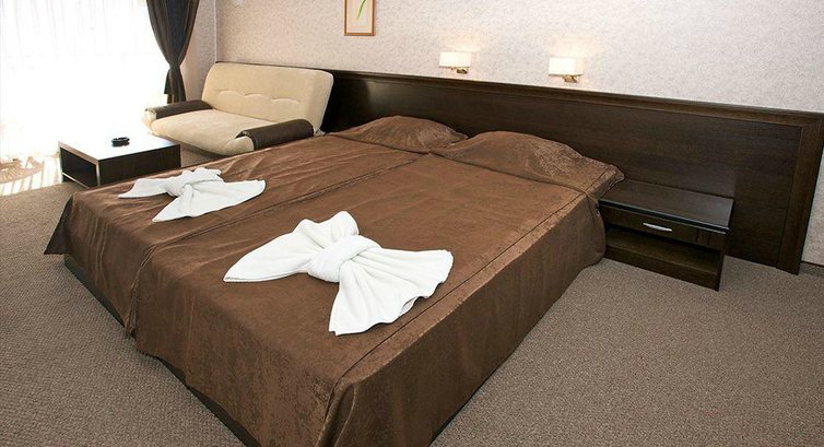 "Отдыхал" в отеле в июне-июле. В отеле большое кол-во школьников с учителями.При заселении в номер(609) удивила чистота полотенец- были очень застираны с пятнами.Кондиционер не работал.В ванной комнате мыльца не кладут,но имеется настенный контейнер с гелем для душа на замке ,чтобы не сперли. Кафельная плитка за дверью вздулась грозя в любой момент обвалиться, потолочные панели прогнулись и постоянно поскрипывали от сквозняков.Высота душа не регулируется и вода летит по всей комнате т.к. нет душевых занавесок. Держатели для полотенец неудобные- полотенца соскальзывают и падают на пол.Держатель для туалетной бумаги еле держится в стене.Чаевые в номере оставлял регулярно( 2 лева) но постельное бельё за 14 дней заменили один раз и снова положили свежие полотенца серо-белого вида! Край выскочившей из карниза портьеры за 14 дней так и не поправили. Пыль со стола и телевизора не вытиралась. Питание в отеле отдельная глава! Сменное посещение ресторана отсутствует и получалось то густо- то пусто. В 7.30 в столовой уже находилось куча народа половина- дети. От сладостей осталась только гора ломанного печенья и крупных крошек, следующий поднос выносить явно не спешили. Решил добрать остатки арбуза из лотка- часть из них оказалась прокисшими! Остатки очень сладкой манной каши кишело огромным кол-ом комков. Вся остальная еда стандарт: ломанные пополам сосиски,сардельки, сыроватый омлет,мягкий и небрежно порезанный сыр,брынза , резанные огурцы и увядшие помидоры ,чай,кофе,сок,вода. Для детей ещё было молоко с какой-то подсыпкой в виде "шариков" и "чипсиков". Удивительно, но я ушел сытым! В ужин еда снова быстро закончилась супа было до краев, но выловить половником из него какую-то гущу было трудно. Очень удивился когда неподалеку от меня старшая официантка с барменом дружно закурили громко обсуждая какие-то бумажные дела! Надписи о запрете курения на трех языках висели рядом. Качество ужинов кулинарным шедевром тоже не радовало : переваренный слипшийся рис,подгоревшая курица или костлявая жаренная рыба щедро залитая ужасным томатным соусом, что наводило на мысли относительно её свежести! Иногда приносил с собой свежие фрукты и более лучший хлеб купленный в супирмакете "ZORA" Безобразие с такой "кормежкой" продолжалась до конца второй недели моего пребывания точнее до 29 июня после чего произошли разительные перемены в качестве питания. Причиной этому ,видимо, послужил небольшой скандал накануне - свидетелем которого я стал. Явившись на ужин в 19.00 я в ресторане оказался единственным посетителем. Супа оставалось на донышке,нехитрый салат почти закончился, о фруктах не стоило и мечтать. Минут через 10-15 в столовую начали подтягиваться запоздалые отдыхающие и с унылым видом ходили между опустевшими поддонами. Одна русская дама стала недовольным тоном выговаривать мальчикам-официантам по поводу отсутствия еды - те только разводили руками и вежливо улыбались. Со следующего дня ситуация изменилась к лучшему! В ресторан стали пускать строго с назначенного часа, что правда создавало давку и неразбериху, но еды теперь хватало всем! Ребята официанты стояли по стойке "смирно" вдоль стены и нервно теребя себя за штаны зорко следили за пищевыми лотками. Как только один из них пустел они сразу меняли его на новый. Появилась нежная ветчина, колбаска, тефтели с кар