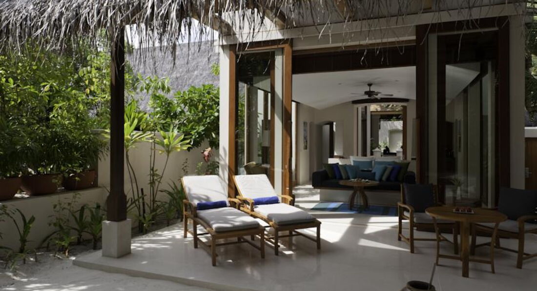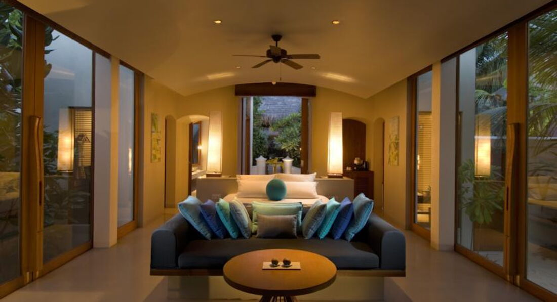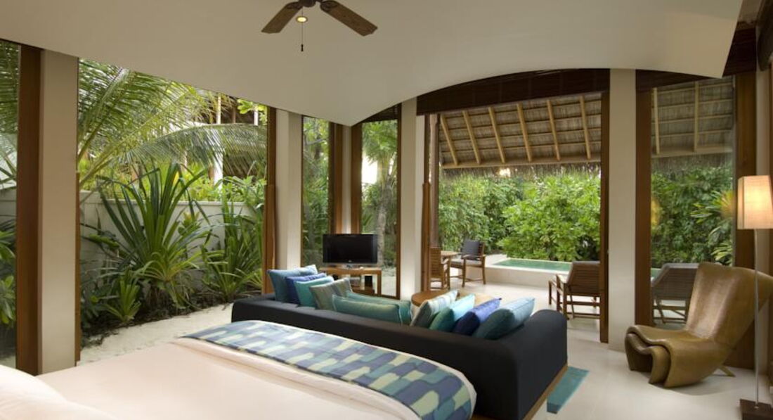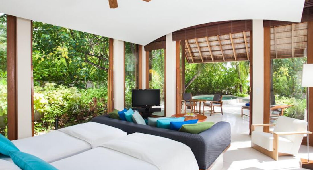 2 Junior Beach Suite (368 кв.м., номери розташовані на острові Rangali finolhu Island. Сполучені Deluxe Beach Villa та Junior Beach Suite. 2 спальні (з видом на схід і з видом на захід сонця), вітальня, тераса, дві зовнішні ванні кімнати Номери з садом та двома басейнами.),