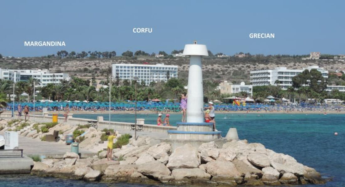 Corfu расположен отлично: ближе к концу Айя-Напы, в 5-7 минутах ходьбы от замечательного протяженного пляжа Понтаху. Пляж Понтаху, переходящий в пляж Грешиан сендс, великолепен: светлый песок, береговая линия более 1,5 км.