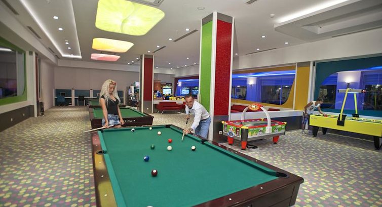 Была в этом отеле в конце мая начало июня 2015 г с детьми 4 и 8 лет. Дети в восторге от аквапарка, горки есть для всех возрастов. С едой проблем не было, особенно дети любили бегать за мороженным, им делали рожки из 4 разных шариков, там же все вместе пили чай в кондитерской особенно понравились рулетики с клубникой и сбитыми сливками, сладости в этом отеле делают на 5+. Про номер: лично у нас хорошо убиралась замечательная женщина, и когда младший ребенок несколько раз проливал на постель колу меняла бельё, хотя я и не просила, спасибо ей большое. Вход в море мелкая галька перемешанная с мелким песком, для ног нормально. Вечерние программы мы смотрели не все, потому, что дети уставали и их клонило спать, но один номер очень понравился, выступали молодые парни на турниках показывали акробатику очень захватывающе. Если выходить из отеля гулять кроме рынка негде, до центра минут 30-45. В отеле очень много казахов, я против них никогда ни чего не имела, но увидев как они себя ведут была в шоке полнейшем, где живут там и срут..., а именно возле сцены есть бар все нормальные люди берут напитки выпивают, и относят стаканы на стойку, эти же всё складывают под стулья, в итоге через 15-20 минут не пройти, если стулья отодвигают всё бьётся, да еще сидят и курят пофиг на всех, в отеле тоже стаканы возле двери или прямо на подоконник составляли, с лежаками вообще учудили, вынесли их из основной зоны прямо возле входа в море и лежат, что в море не пройти, в итоге администрация отеля поставила колышки с верёвками чтобы лежаки не трогали. Из моих наблюдений они ездят толпой по 6-8 человек (мужья, жены, дети, бабушки, тетки...) и в ресторан засылают своих бабушек или тёток, чтобы те занимали место, очень смешно, когда они влетают как только открывают ресторан и сидят за пустым столом из 6 персон отгоняя всех от попытки сесть рядом или взять стул, такую картину я наблюдала раза 4 все кто пытался сесть за столик уже поесть успевали и уйти, а она так и сидела охраняла пустой стол так и сидит. Казахские дети тоже культуре не учатся 10-12 лет ребенку он куда хочет туда и писиет (хотя туалет на каждом шагу), а взрослые только хихикают делаешь замечание полный игнор, "он же ребёнок" ТЕЛЁНОК вымахал, а ума кот наплакал, в ресторане очередей для них не существует, они берут ложку с соседнего блюда или руками лезут и впереди планеты всей, по газонам носятся, цветы рвут, дикие какие-то. Лично мне трудно не обращать на это невежество внимание. Люди хорошего отдыха!