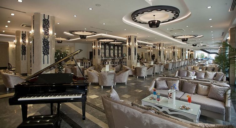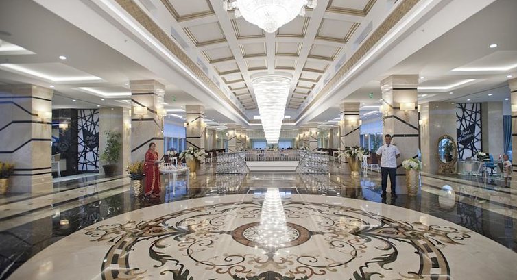 Даже не знаю, с чего начать... Заселили, как обычно, в 14:00. По приезде, сразу пошли обходить территорию. С первого взгляда отель производит впечатление огромной территории, в которой можно заблудиться. На следующий день уже становится ясно, что отель вовсе не большой, а просто вытянутый, ну прям очень вытянутый. Нас заселили ну просто как можно дальше от моря. А главный ресторан находится именно ближе к пляжу. Но все продумано, и прямо у нашего корпуса кафешка, где можно хорошо перекусить. Но мы ходили в главный ресторан. Много ходить - это то, что мы любим. Но даже у меня на четвёртый день ноги подустали))) Но это всё плюсы. Ещё один огромнейший, ну супер-пупер плюсище, это то, что все это большое расстояние можно проходить по приятному, красивому, а главное прохладному "туннелю". Он проходит через весь отель. Также в нем расположено кафе, что очень удобно. А туалеты в нем через каждые 50 метров. Очень удобно это, особенно, когда во время максимальной солнечной активности, ты спокойно пробираешься под тенью в прохладе. (Такое я видел только в очень дорогих отелях Турции). Кстати, вообщем здание отеля очень красивое и выглядит богато, но не наляписто. Все так, как и должно быть. Но вот территория вся забитая, скученная. Впечатление, что хозяин пытался использовать каждый метр отеля, так что живописные лужайки или ряд кустарников вы там точно не увидите. Два-три дерева на весь отель.