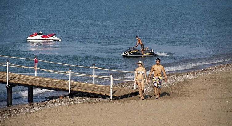 Пляж галечный, на пляже вместо зонтов огромные тенты на металлических опорах, в разы удобней зонтиков, есть бар, гюзлеме, пирс с которого можно нырять или рыбачить (кстати рыбачить бесполезно, перепробовал все возможные наживки - результат ноль! Удочку вернул), на пляже есть все привычные водные развлечения, но нам они не интересны, взяли рыбалку по 50$ с носа, рыбачили со спидбота, ловили морских окуней и прочую кильку размером меньше ладошечного, время провели не плохо, с катера можно понырять.