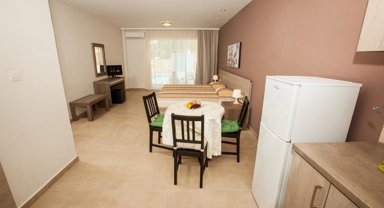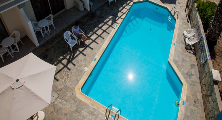 Отель расположен в тихом месте, но близко от всего, что нужно: пляж - около 10-12 минут, супермаркет - около 7-8 минут - "Papaantonio" , столько же до торгового центра " Джамбо". На пляж идешь мимо исторических развалин, Археологический парк Пафоса - в пешей доступности, порт и променад с ресторанчиками и магазинами - рядом. Внутри номера полностью соответствуют фотографиям на сайте. Очень чисто, убирают каждый день, постель и полотенца меняют, кажется, через день. Есть все, что нужно, чтобы приготовить обед или ужин, если не захочешь идти в кафе или ресторан (и техника и набор посуды). Бассейн маленький, чистят его каждый день, рядом с ним - душ, туалет, лежаков хватает всем. Но мы только один раз пользовались бассейном - рядом такое красивое море! В бассейне и вокруг него постоянно отдыхали англичане. Я вообще не понимаю, зачем некоторые из них приехали на Кипр: днем парились у бассейна, вечером на рецепшене (30 кв.м.) с пивом у телевизора. Мы уходим - они там, мы приходим - та же картина. Но никто никому не мешал, вежливо здоровались, улыбались. На Кипре есть более удобные отели, но мы выбирали за небольшие деньги и не разочаровались. Хозяева отеля очень хорошие люди, на все просьбы отзываются, даже если это не входит в обязанности - объясняли, куда как лучше добраться. Среди женщин, которые убирают в отеле, есть русская - Татьяна - очень приветливая, всегда помогала объясниться с хозяином (у меня с языками не очень). Кстати, насчет неторопливости киприотов - утром, уходя на пляж, сказала, что перегорела лампочка в санузле, пришли с пляжа - все работает. Отель рекомендую тем, кто хочет много посмотреть (мы в номере не сидели - море, достопримечательности, экскурсии), а между интересными днями отдыхать в чистом и удобном номере. Для детей ничего нет.