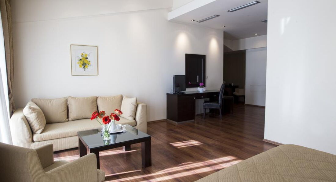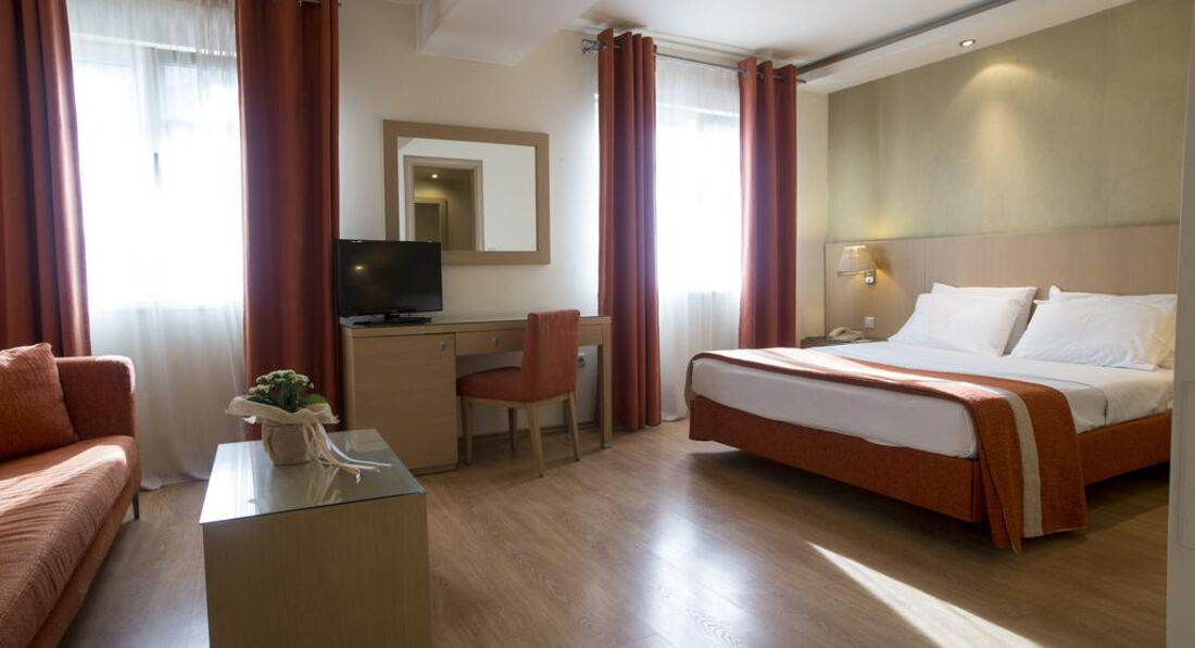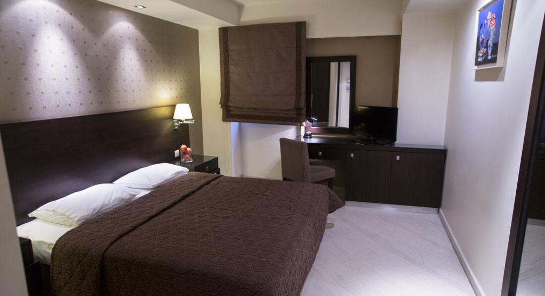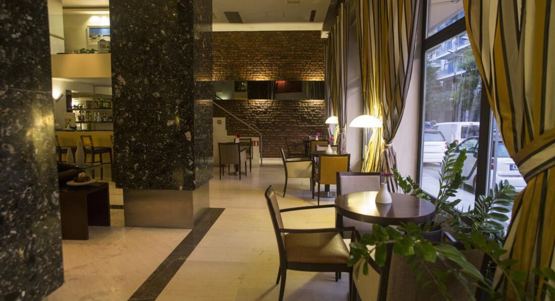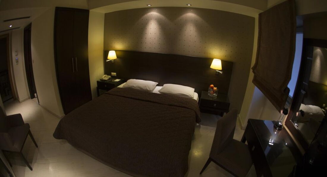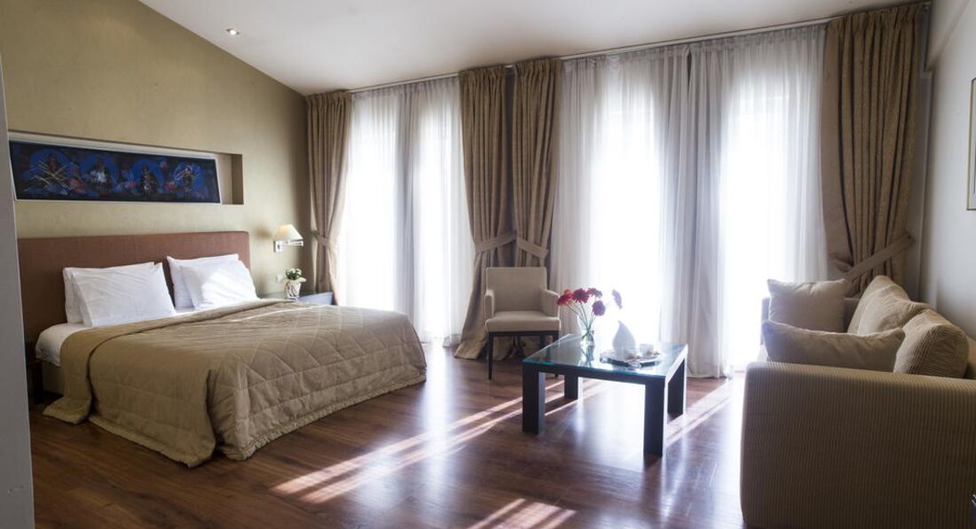 Територія та послуги: Автостоянка - платна автостоянка за 50 м від готелю. Інтернет - безкоштовний Wi-Fi інтернет у громадських місцях Конференц-зал – 70 кв.м., місткістю до 50 осіб, бізнес-центр Обслуговування номерів Сейф у номері – безкоштовно Кафе - бар, зал для сніданків Живлення: Сніданок. Пляж: Найближчий пляж Агія Тріада за 20 км. До оплати приймаються кредитні картки: Visa, MasterCard, Amex, Diners.