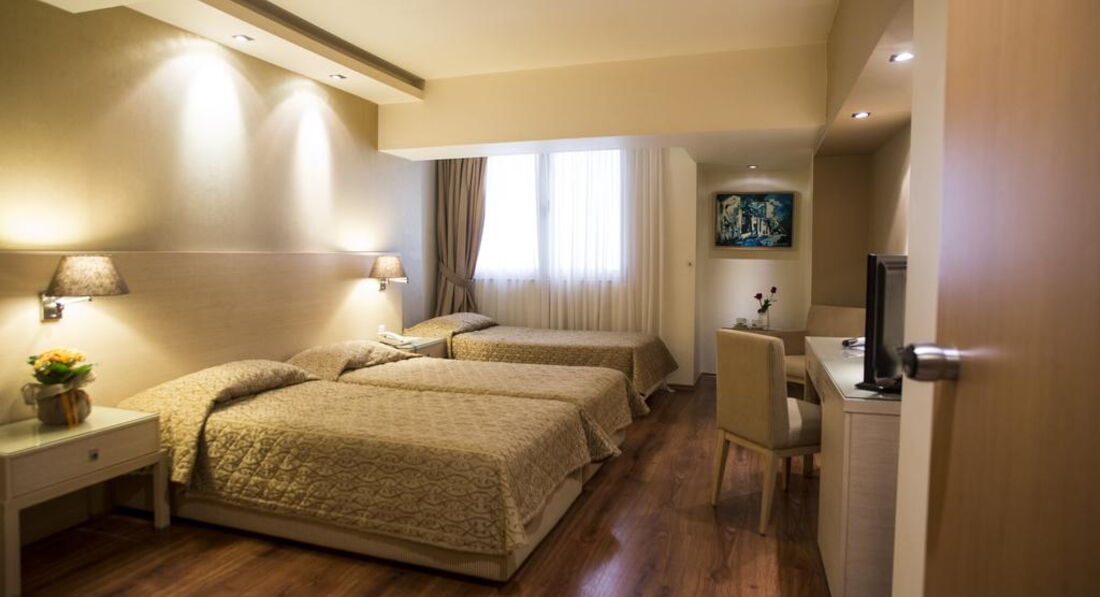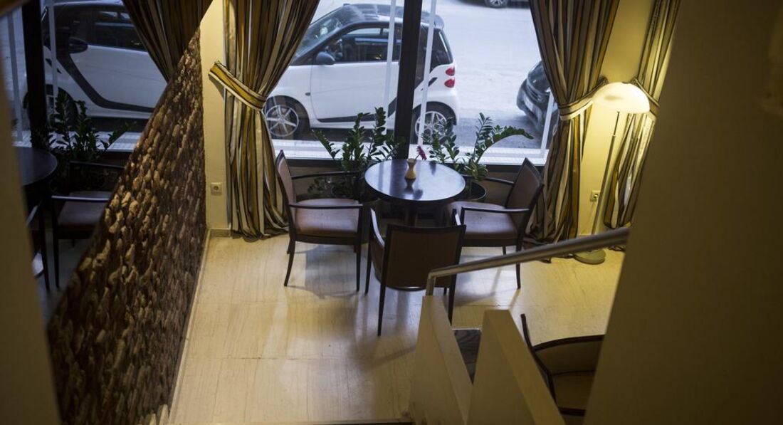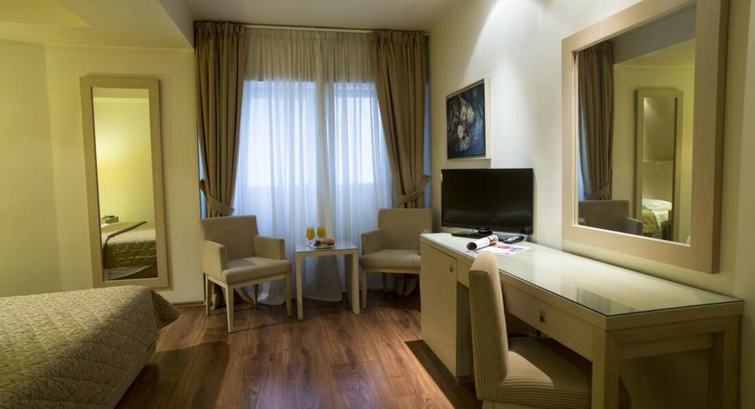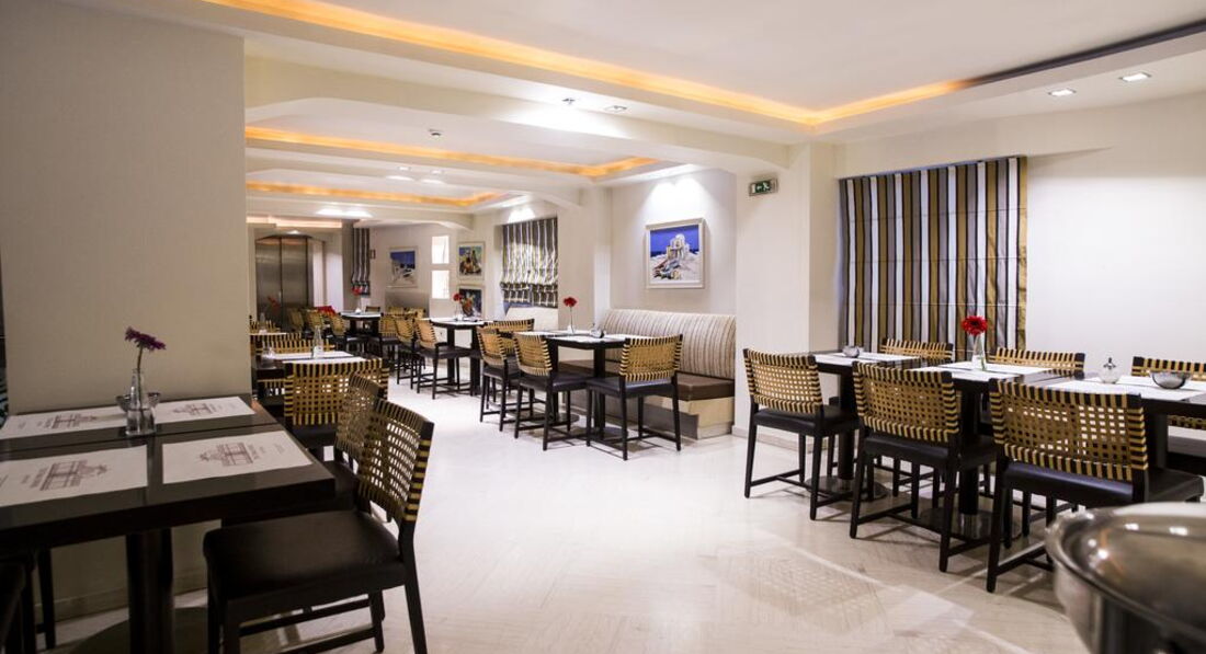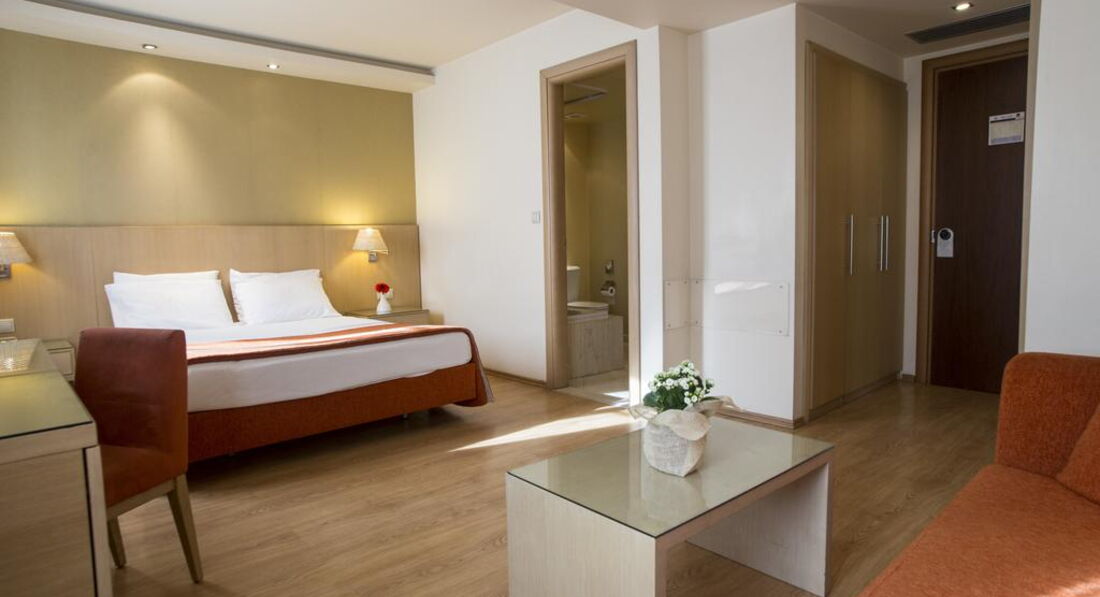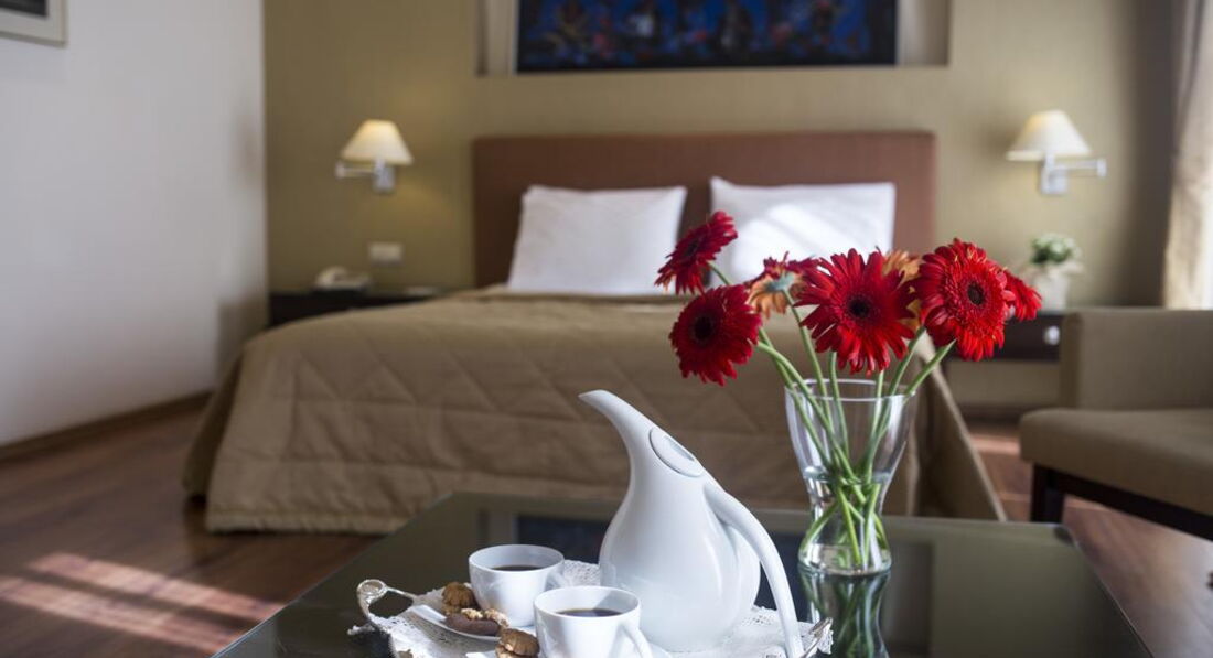 Територія та послуги: Автостоянка - платна автостоянка за 50 м від готелю. Інтернет - безкоштовний Wi-Fi інтернет у громадських місцях Конференц-зал – 70 кв.м., місткістю до 50 осіб, бізнес-центр Обслуговування номерів Сейф у номері – безкоштовно Кафе - бар, зал для сніданків Живлення: Сніданок. Пляж: Найближчий пляж Агія Тріада за 20 км. До оплати приймаються кредитні картки: Visa, MasterCard, Amex, Diners.