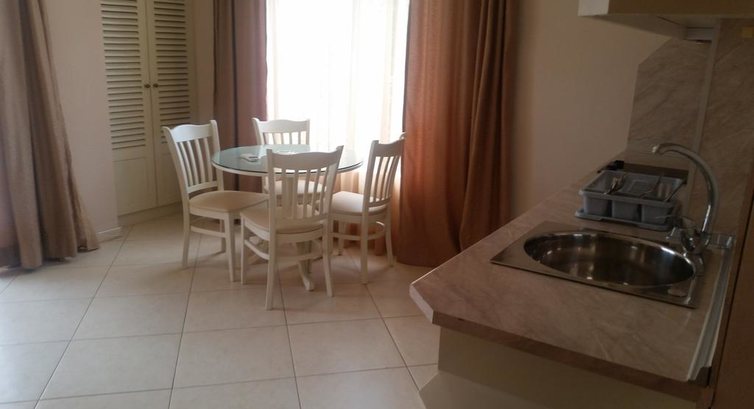 Номер и отель полностью соответствуют фото! Светлые аппартаменты с хорошим интерьером. В кухонном уголке есть вся необходимая посуда, а так же чайник, плита, микроволновка и тостер. В ванной - душ. Из мебели: кровать, диванчик, столик, шкаф и уголок с зеркалом, вообщем места для вещей вполне хватило и даже осталось много пустых шкафчиков.