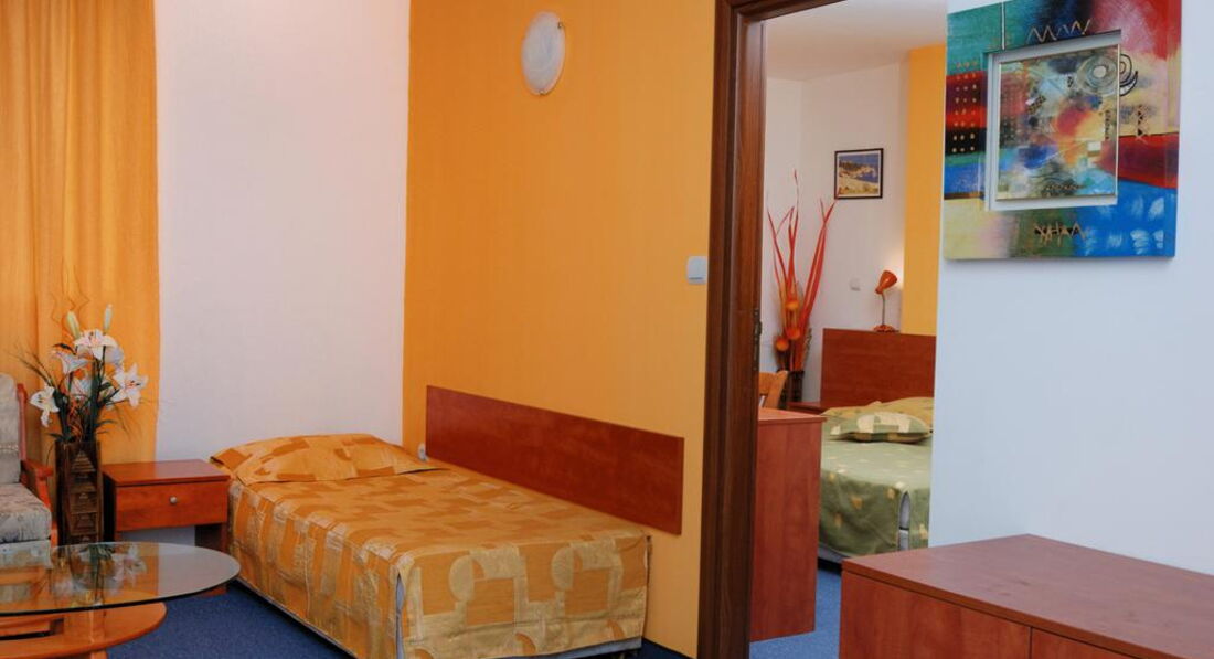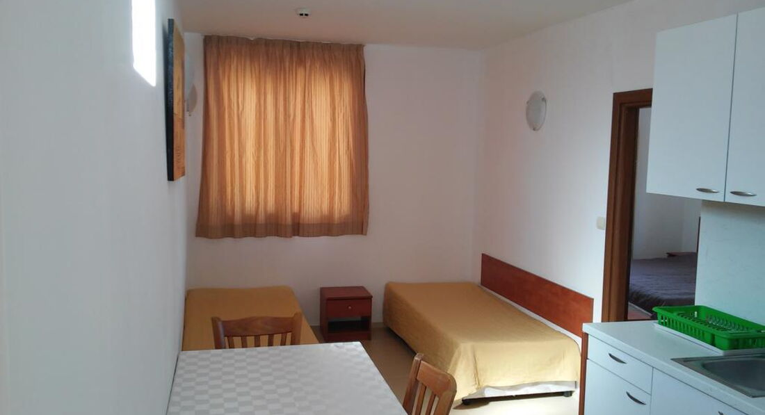 Apartment - спальня з двома односпальними ліжками та розкладним кріслом, вітальня з двома односпальними ліжками та кухонним куточком (плита, мікрохвильова піч, електрочайник, посуд, столові прилади), суміжні двері, макс. 4 + 1 чол., 45 - 55 м2.