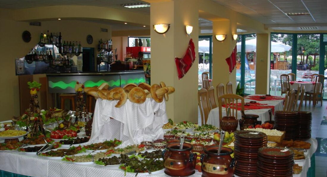 Питание приличное для отеля тройки. Завтраки полноценные - сыр, брынза, колбасы, свежие овощи, яичница, сладкие булочки, хлеб вкусный, яйца вкрутую, простокваша, 3-4 вида джемов, молоко. Горячие пончики, гренки. Кофе и чай и т.д. Обеды скромные, но голодными не останетесь. Ужины приличные. Многие отдыхающие только завтракали. Мы много гуляли вечерами, поэтому часто ужинали где придётся. Пробовали болгарскую кухню, местное вино. Рядом с отелем (если выйти и пойти налево вдоль проезжей части) расположен ряд магазинчиков, первый из них - вина на разлив. Брали там прекрасное вино с гранатовым соком и красное Каберне-Совиньон. 8 левов за литр. В последний день обедали в ресторанчике у мексиканца (мы так его прозвали за шляпу) Направо от отеля пройти немного, его трудно не заметить, так как приглашает всех зайти на ужин. Еда вкуснейшая, порции огромные. Вечерами бывает живая музыка.