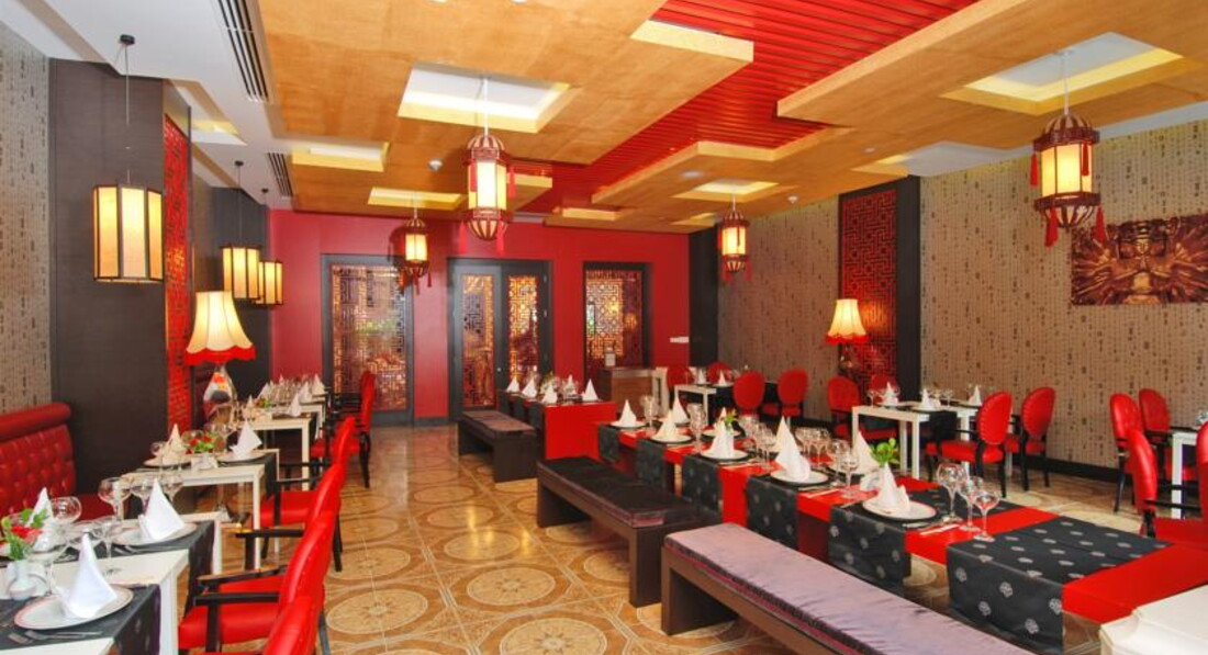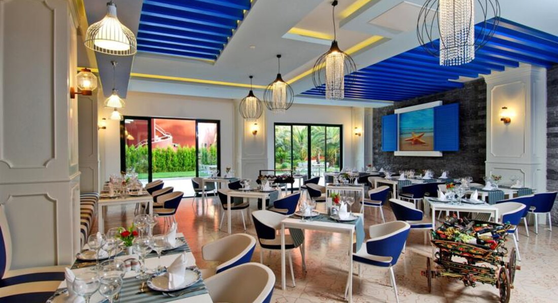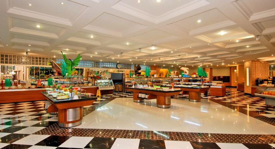 Бари та ресторани: головний ресторан розрахований на 1000 осіб (критий, з кондиціонером, літня тераса, дієтичне меню, дитяче меню, дитячі стільці), лобі-бар (09:00-02:00), бар біля басейну (10:00- 18:00), бар на пляжі (10:00-18:00), диско-бар (23:00-02:00), вітамін-бар (11:00-18:00), кава-шоп (09: 00-24:00), паб (23:00-06:00) та ін. 7 ресторанів A la Carte: китайський, японський, італійський, турецький, рибний, мексиканський, суші – безкоштовно, за попередньою резервацією.