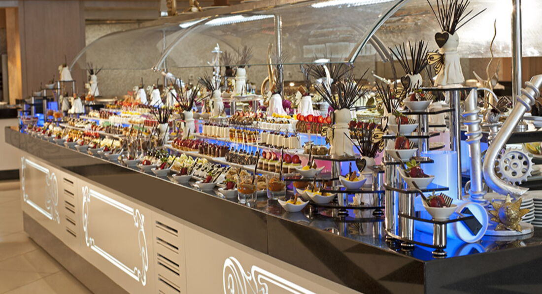 Зимой концепция питания ультра все включено: основной ресторан: завтрак с 7-00 до 11-00, обед с 13-00 до 14-30, ужин с 18-30 до 21-00. Причем можно прийти в 14-25 и спокойно пообедать, еды будет достаточно. Также в баре Камелот можно покушать горячего (три вида гарниров, суп, три вида мясного, салаты, пирожные, фрукты) где-то с 12-00 до 18-00, ночью с 0-00 до 7-00 также можно покушать. Также бесплатно работает рум-сервис в ночные часы с 0-00 до 6-00 - можно заказать еду и напитки по меню. Мини-бар бесплатный в номере, пополнение каждый день. Прямо у входа в отель столик с вином, шампанским и печеньками для всех гостей отеля (наш гид, когда забирал нас, взял печенье с собой;-)) По ассортименту блюд в основном ресторане (основные моменты): на завтрак - красная рыба соленая, шесть видов молочных каш, свежевыжатые соки и смузи, различные виды деликатесных сыров в отдельной витрине (выдаются порционно) ; на обед - три вида супа, в том числе куриный (не пюре), на обед меньше разнообразие, чем на ужин; на ужин - курица, индейка, телятина, ягненок, рыба белая, красная, мидии, коктейльные креветки, из гарниров - картофельное пюре, рис, овощи, картофель фри, макароны, паста (готовят при тебе). Зал с питанием для детей не работает, но есть диетическое питание - отварная курица, картофель, морковь. Есть блендер, баночное питание, соки в пакетиках детские. Говорят, очень хорошие рестораны Аля карт (мы не посещали, т.к. с маленьким ребенком тяжело наслаждаться длительным приемом пищи). Напитки в барах и ресторанах официанты приносят к столу. Большая коктейльная карта, есть детские коктейли, кофейные коктейли, мороженое. Из интересного - есть бар с кофе и пирожными, есть шоколад-бар.