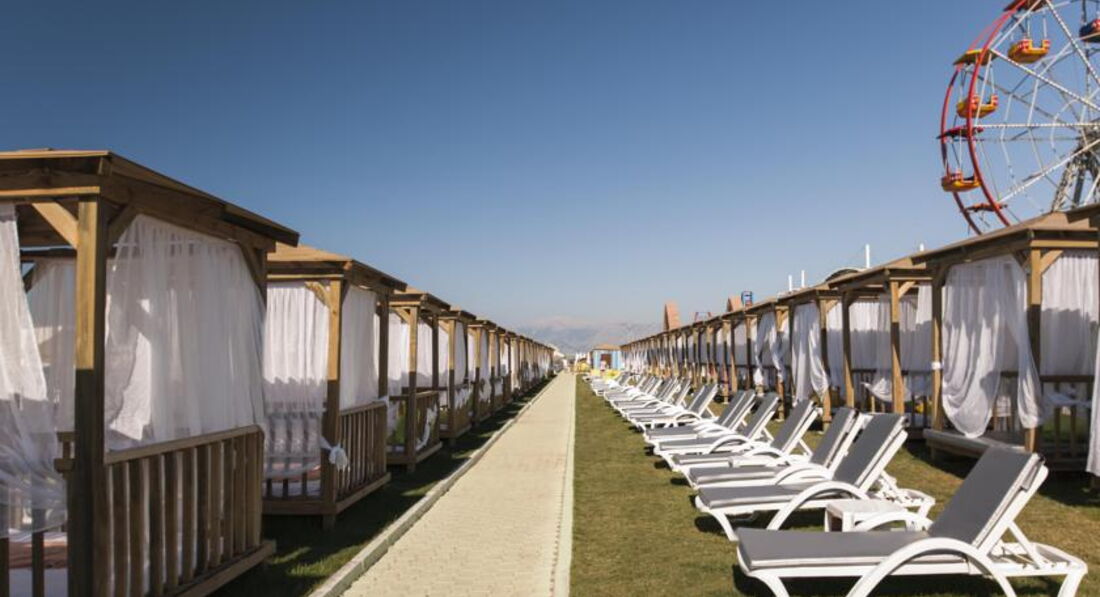 Мы отдыхали на пляже. Есть домики БАЛИ с маленькими зелеными территориями и отдельным индивидуальным обслуживанием за 30 Евро на день. В море уходит пантом, на нем бар и лежаки, которые пользуются популярностью у тех, кто любит музыку погромче. При входе в море мелкая галька, полоса около метра, а так везде песок, через метров пять сразу глубина по шею. Море в конце сентября +28, просто супер!