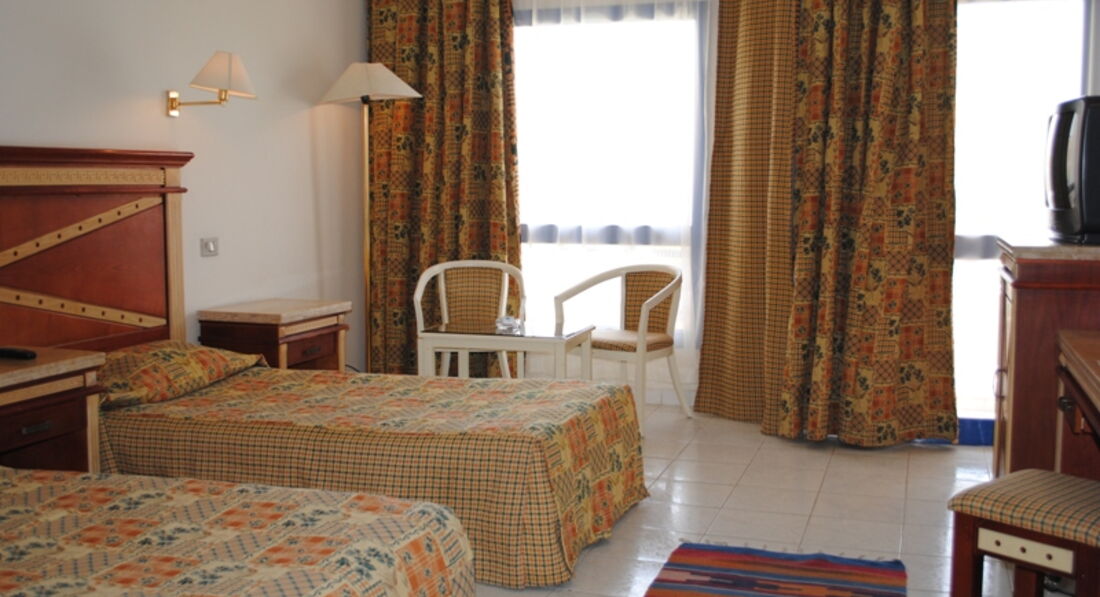 Далее по всему- на ресепшене менеджер Ахмед- потная рубашка чайного цвета рваная под мышками- разве визитная карточка отеля в центре города может быть такой? в номере ломаный торшер и 2 кресла на балконе, телевизор старый GoldenStar- неплоский с 2 русскими каналами- антенну надо поправлять, чтоб показывал, сразу предупредили, что если мы что то сломаем- нам штраф- а когда заселяли- никто не показал нам что это и это сломано. следовательно если мы обратимся- будут считать что сломали мы. один раз уборщик сломал крышку мусорного ведра в ванной, мы заявили, нам инна сказала что поменяют, не поменяли. один раз за 11 ночей у нас не убирались, как нам сказала инна - уборщик до нас не дошел просто- много заселений и выселений было в тот день. это вообще нормально? в номере был песок в кровати когда заселились и белые волосы на покрывалах (мы с мужем брюнеты). мыло только в дозаторе. ершика и душа для смыва унитаза нет, вешалки в шкафу не достать из шкафа- видимо чтоб не своровали. сейфа в номере нет. для входа в номер используется не карточка электронная как везде, хотя есть остатки приспособления для ее чтения, а обычный ключ. карточек на полотенца пляжные нет- они меняются строго с 17 до 18 у главного ресторана нашего отеля, а пляж находится на территории другого отеля- пройти метров 300 по городу до него- от есть нам было нужно шататься с полотенцами через город и магазины. иногда стояли минут по 20 в указанном месте у ресторана, но полотенца не меняли. Большое количество русских пенсионерок устроили совок везде- очереди на пляже- с раннего утра (часов с 7) до обеда (до 13) примерно, у входа в столовую очередь минут на 15-20. еда была разнообразная, но тк питались сразу 2 отеля, то основных блюд хватало тока вначале- бабкам организующим очередь, во вторую партию уже дадут не гуляш, а тефтели с рисом (почувствуйте разницу). аниматоры не зажигают- тоже придерживаются советских стандартов- фраза одной из девушек из них- "я вас за уши тянуть буду на зарядку", а увлечь не могут. выход из моря- закрытие пляжа и купания- по свистку (как в пионерлагере). выпивка отвратительная, как вся местная, но только здесь мы узнали что местная бывает плохая и очень плохая (как в этом отеле). в баре бармен спрашивает каждого где второй, третий человек при заказе- то есть при типе питания "все включено" он пытается дать по одному стакану одному человеку. зато из под полы пытается продать алкоголь бутылкой (0,5 за 10 долларов). у нас был номер с видом на стену- на главную улицу, но это лучше чем у наших соседей- с видом на отельную дискотеку- у нас было не особо возможно заснуть трезвому, а в их номере спать невозможно вообще. в общем заплатив 90 тыс - в 2 раза больше чем в прошлый раз за лучшие отели- хотели убраться скорее из отеля. в следующий раз тока не туда