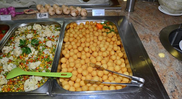 Обед всегда разнообразный. Супы двух видов, большой выбор овощей, запеченых, свежих, в салатах.