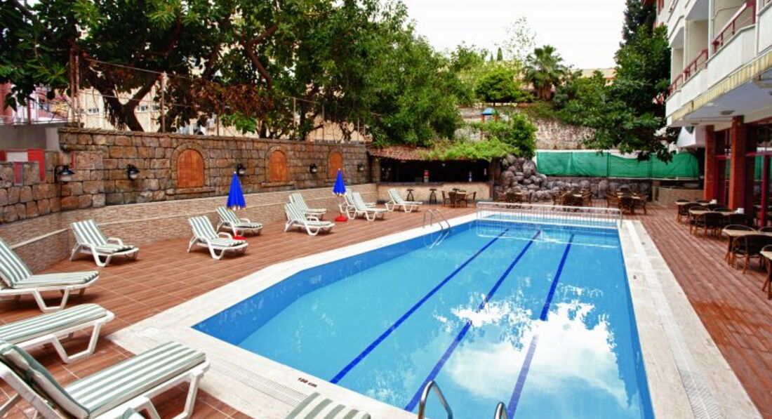 В полне не плохой 3* городской отель находящийся в самом центре алании.Т.к. мы отдыхали в январе ночью было холодно,туристов было мало,поэтому писать то сильно и нечего.бассейн очень маленький,питание скудненькое (видимо из-за не большого кол-ва туристов),но номер был чистый и убирали его через день.В отеле только ели и спали,остальное время проводили в не отеля,т.к. разгуляться было где,ни каких толкучек и все рядом.За 20000 тысяч на 2 их на 9 ночей впринципе остались довольны.