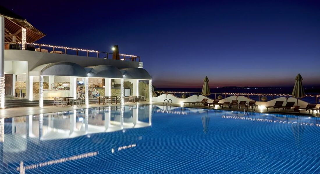 Территория отеля хорошо продумана. Постоянно убирали, поэтому было чистенько. Бассейн с морской водой. Можно было поплавать и после захода солнца. Над рестораном на веранде есть джакузи с проточной прохладной водой, где моно охладиться и посмотреть на прекрасный открывающийся вид.