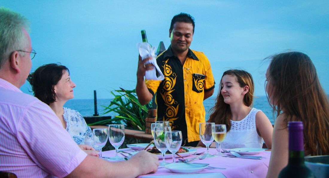 Питание вне отеля. Завтрак и ужин проходил у Пьера - кафе второе слева. довольно популярное. Но так же можете сходить и в другие кафешки. Цены примерно одинаковые везде +\- 100 рупий. Суп с морепродуктов (вкусный) - 1200 рупий = 10 долларов. Креветки гриль с лаймом - 11 долларов + бонусом идет картошка фри, рис с кари и тарелка с фруктами. Можно попросить запаковать с собой. В каждом номере есть холодильник. Обязательно попробуйте марлина - очень вкусно. Не отказывайте себе в удовольствии. Гормоны счастья вырабатываются в организме 2 путями - секс и пожрать. Так что не отказывайте себе в удовольствии. Экономить будете на родине. Интересная закономерность - чем чаще вы к ним ходите, тем больше порции. Приготовьтесь что официанты у вас будут стоять над головой. У них это нормально. Причем, их может быть и двое и трое. :) забегая на перед скажу, что они и будут вам предлагать экскурсии. У них нет разграничения на повара и гида. Каждый зарабатывает деньги как может.