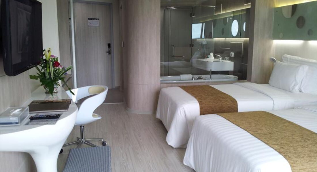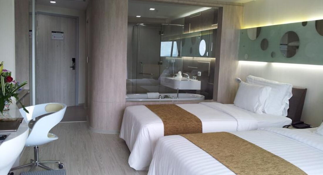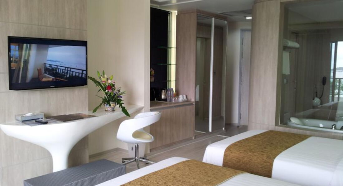Отель в современном стиле, все номера имеют шикарный вид на море. Номера большие светлые, все чистенько, но с нами произошел такой казус: За время своего путешествия мы останавливались в пяти отелях, и только в этом взяли у нас депозит 2000 батт, так вот в день выселения обнаруживается что одного халата в номере нет и типа заплатите стоимость его. После моих объяснений, что мол мы его не брали и если надо проверяйте вещи, нам вернули депозит, но при этом не извинились и были явно чем то не довольны. В целом отель мне понравился находится на первой улице через дорогу море. Но мы там не купались, мы вообще в Паттайе нигде не купались. Уезжали на острова, после них море в Паттайе кажется помойкой. Завтраки как и везде в отелях стандартный набор, яичница, омлет, рис, картофель, овощи, фрукты, выпечка. Территория отеля не большая и не зеленая, вся такая современная без лишнего. Очень понравилось на этажах играет такая приятная музыка. И еще мне кажется соотношения цена качество в этом отеле на мой взгляд самые лучшие. Мы жили в Делюксе на 7 этаже за 77$.
