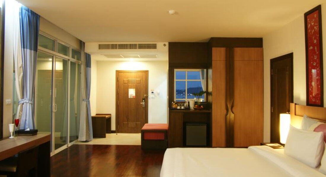 8 этаж, вид на сиамский залив, огромная кровать, холодильник, сейф, вай-фай, фен, душевая кабина, ванна, тапки, полотенца, балкон, посуда, телевизор ЖК (5 русских каналов) - все супер !