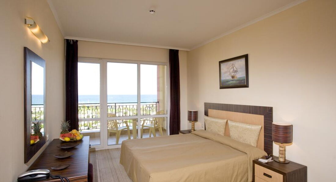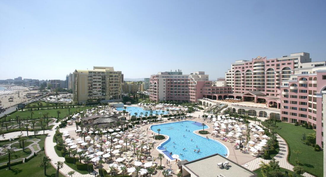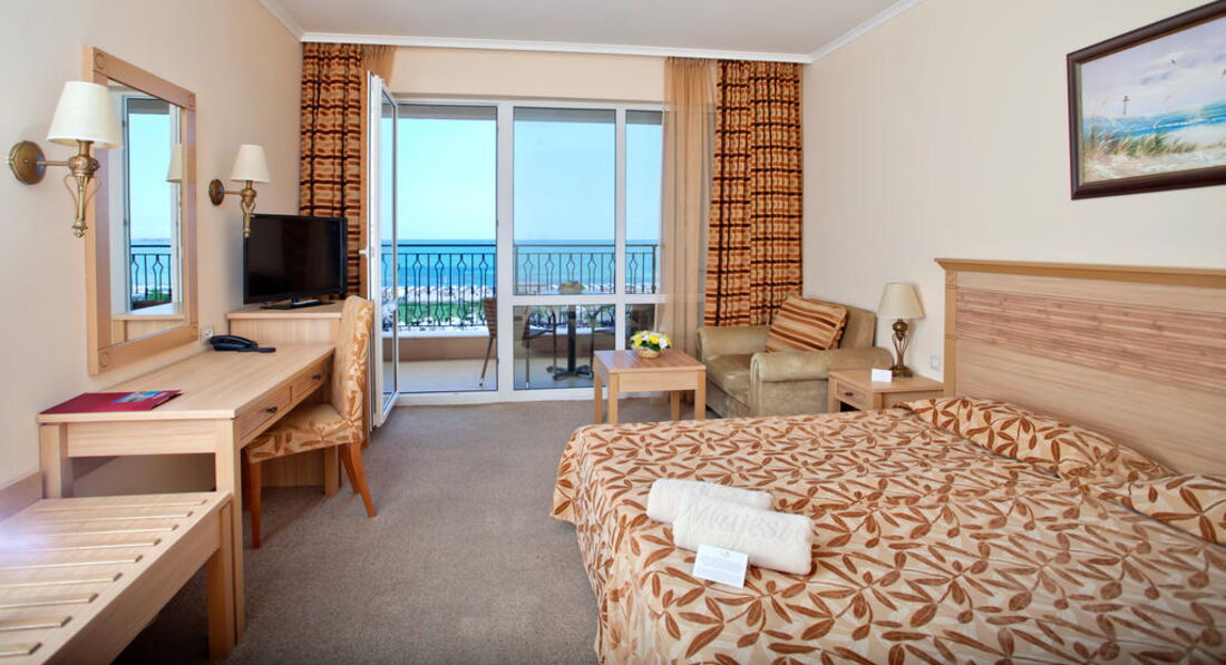 Отдыхали неделю в этом замечательном отеле с 27 августа по 4 сентября, туроператор Санмар. Приехали в отель рано в 10 утра, нас было две семейные пары. По нашей просьбе нас заселили в номера, которые находятся рядом, при этом ждать время заселения не пришлось. В 11 часов мы уже были в номере и смогли быстро переодеться и пойти на море. На ресепшн работает очень отзывчивый молодой человек Владислав со Львова, он быстро и оперативно помогает решить все вопросы, большое ему спасибо. Да и весь персонал отеля доброжелателен, улыбчив и многие говорят на русском языке. Как мы поняли, при наличии свободных мест всех заселяют и не ждут 14 часов. Отель на первой линии, море чистейшее, в шторм прибивает водоросли, но это не страшно, их не много. Лежаки у бассейнов новые с мягкими матрасами, нет смысла покупать лежаки у моря, дойти до моря 1 минута. Бассейны чистые и неглубокие. Питание в отеле выше всяких похвал, меню постоянно меняется. Есть всё: молочные поросята на ужин, сёмга, форель, индейка, морепродукты. Фруктов просто изобилие. Детский стол в отеле отличный, на завтрак молочные каши, йогурты, творог трёх видов. Супы в отеле настоящие, мясные, не пюре, всегда двух видов. Территория чистая, номера просторные. Похоже это единственный отель на солнечном береге, где есть своя территория. В других отелях территория совсем маленькая. Анимация в отеле не навязчивая, своими силами. Несколько раз после анимации над отелем был фейерверк, за что особое спасибо администрации отеля. Ресторан болгарской кухни аля-карт заслуживает высокой оценки, всё очень вкусно, но порции огромные и съесть не возможно. Я не сторонник отдыхать в одном и том же месте, но в этот отель приедем ещё. Спасибо за прекрасный отдых в великолепном отеле! В целом Болгарию можно рассматривать как хорошую альтернативу Турции и Египту за мягкий климат и доброжелательное отношение к русским.