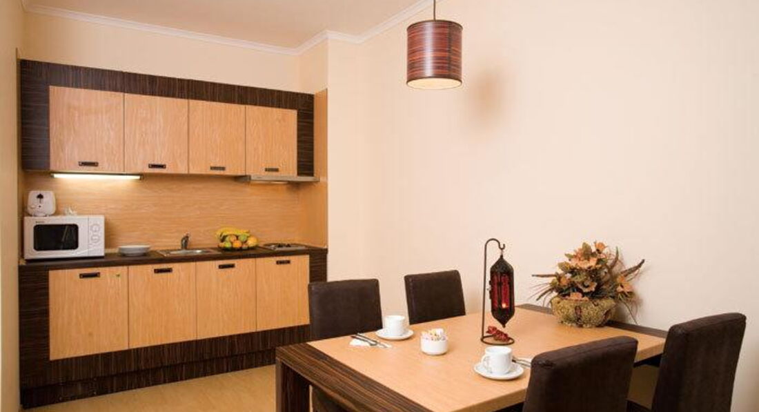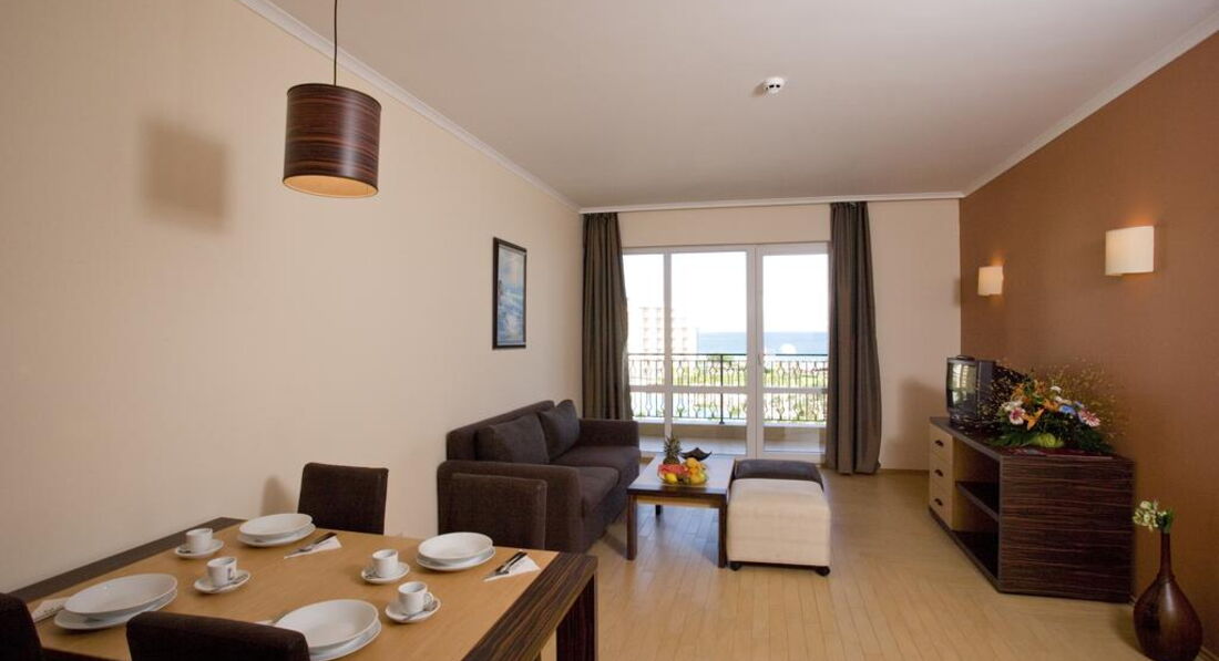 Отдыхала в этом отеле с семьей. Летали компанией Пегас, к ним претензий как всегда нет. Приехали мы в отель в 7 часов утра, заселение заняло 5 минут. Языкового барьера не возникло, тк практически все сотрудники разговаривают на русском. Дали номер на втором этаже 2218, с видом во двор (мы были рады тишине, тк окна и балкон были постоянно открыты) Апартаменты были отличные, кухня-гостиная и комната. В номере все работало исправно, уборка проводилась каждый день, полотенца тоже менялись каждый день. Так же нас сразу пригласили позавтракать. Ресторан на 0 этаже довольно таки большой с большим разнообразием блюд, есть все. Единственный минус- это порошковые соки. Мы брали питание НВ, но ресторан на ужин предоставляет еще и напитки на выбор бесплатно: на человека -2 напитка (пиво, вино, газировка или вода). Во время пребывания в отели еще и отметили день рождение моей мамы, я заранее у отельного гида заказала торт праздничный со свечами на завтрак (прим.1000руб) и букет из роз (прим.1000руб) на ужин в болгарском ресторане "Булгари", там можно поужинать 1 раз за время пребывания в отеле тоже бесплатно, только необходимо записаться).