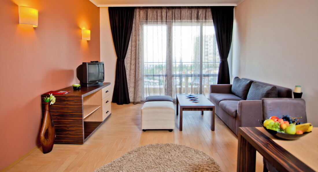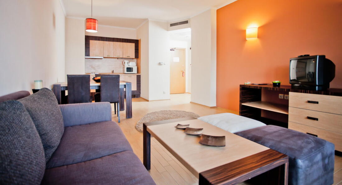 Apartment – з видом на парк, спальня з двоспальним ліжком, вітальня з розсувним диваном та міні-кухнею (ел. плитка, мийка, витяжка, холодильник, тостер, мікрохвильова піч); суміжні двері, макс. 2 дор. + 2 дит. або 3 дор., 58 м2.
