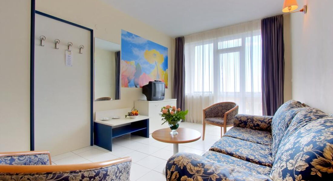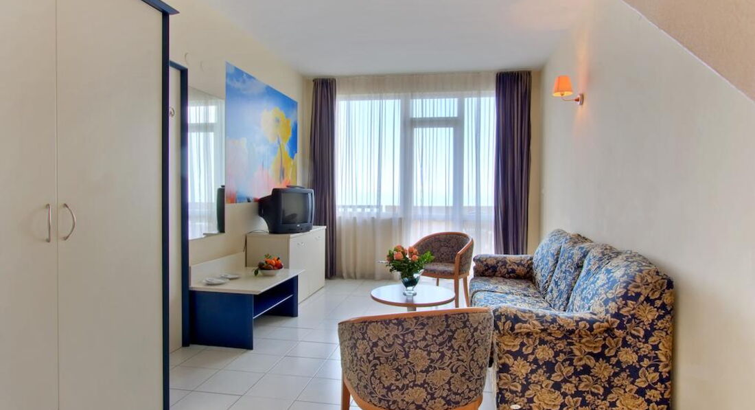 Бронировали данный отель еще в январе по принципу близости от местонахождения детского спортивного лагеря, куда собиралась дочь в составе спортшколы. Отзывы особо не читали, деталями не интересовались. Ближе к теме, почитав негативные отзывы на данном сайте, начали потихоньку приходить в ужас от написанного и желание ехать в этот отель стало пропадать. Засада была в том, что бронь на отель была невозвратная. Пришлось ехать с некоторым осадком на душе, благо компания была веселая, что как-то приободряло. Полет (бронировали отдельно) прошел нормально, и вот мы в аэропорту Варна примерно в 7 утра. Такси до отеля 16 лев и 20 минут времени. Заселение с 14-ти часов, но улыбчивые девушки на ресепшене оформили нас где-то в районе 11 часов. Номера дали всем двухярусные. Они рассчитаны на семью из 4-х человек, мы же проживали в номере вдвоем. На наш взгляд отличный номер - шикарный вид на море, 2 санузла. Мебель конечно далеко не новая, но в приличном состоянии. Уборка была каждый день, в общем все было достаточно на хорошем уровне, живности никакой в номере не видели.