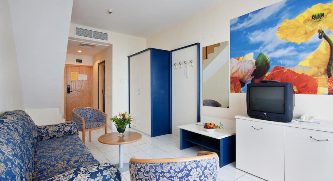 Номер приятный с видом на море. В номере все устроило, ничего особенного и не ждали. Для дочери поставили отдельно кровать-раскладушку.Из минусов: слишком большая слышимость того что происходит в коридоре и вечерний шум с дискотеки, а также еле работающий wifi, скорее даже не работающий совсем.