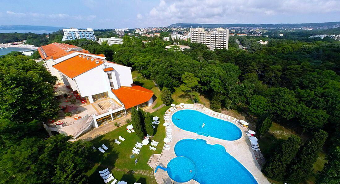 Отель расположен в комплексе Гранд Отель Варна. По сравнению с соседями по общей территории комплекса имеет самое выгодное расположение, непосредственно на берегу моря. Отель семейный: после 10.06 стало очень много детей, суетливо и шумно в лобби и ресторане. Все окна отеля с видом на пляж, бассейны и за ними само море. Брали all inclusive, остались очень довольны: питание разнообразное - мясо, рыба, птица тушеные и на гриле, салаты, закуски, овощи, фрукты- все достаточно свежее и вкусное. Номер стандарт: 2 взрослых+2 ребенка на доп.кроватях, стол, стул, тумбы, шкаф, старинный телевизор (пульт не работает, но смотреть не было необходимости), и все!!!! Первое разочарование: нет холодильника, второе - на весь номер 2 розетки ( 1 для ТВ и 1 в шкафу!!!) обслуживание и уборка зависят от смены, оставляли чаевые, но одна смена убирала очень хорошо, другая только меняла полотенца, оставляя грязь и песок на полу, и забывая добавлять шампуни и гели. Покрывала на доп кровати не предусмотрены, песок и в них был. WiFi бесплатно работал только на балконе или возле окна, возможно потому что отель находится в скале, в лобби и на пляже ловит отлично. Входа в море у отеля нет, надо пройти по берегу к соседнему Рубину. Там несколько пляжей, лежаков и зонтов много свободных, плюс есть кафе с ограниченным меню для гостей отеля. На территории также есть мини-клуб, анимация для детей, мини-диско. Анимацию для взрослых не встречали, кроме йоги и утренних танцев на траве возле Лебедя, не лучший выбор места, сыро и грязь, лучше бы на пляже тогда. Пляж и море чистые, убирают регулярно. Вход в воду песок. За территорией очень близко много кафе, ресторанов, магазинов, термальные бани, рынок. До городского автобуса минут 15-20 пешком или на местном трамвайчике, стоимость его на компанию равна стоимости поездки на такси до самой Варны. В общем впечатления остались самые лучшие, несмотря на недостатки. Позитив преобладал, собираемся приехать еще.