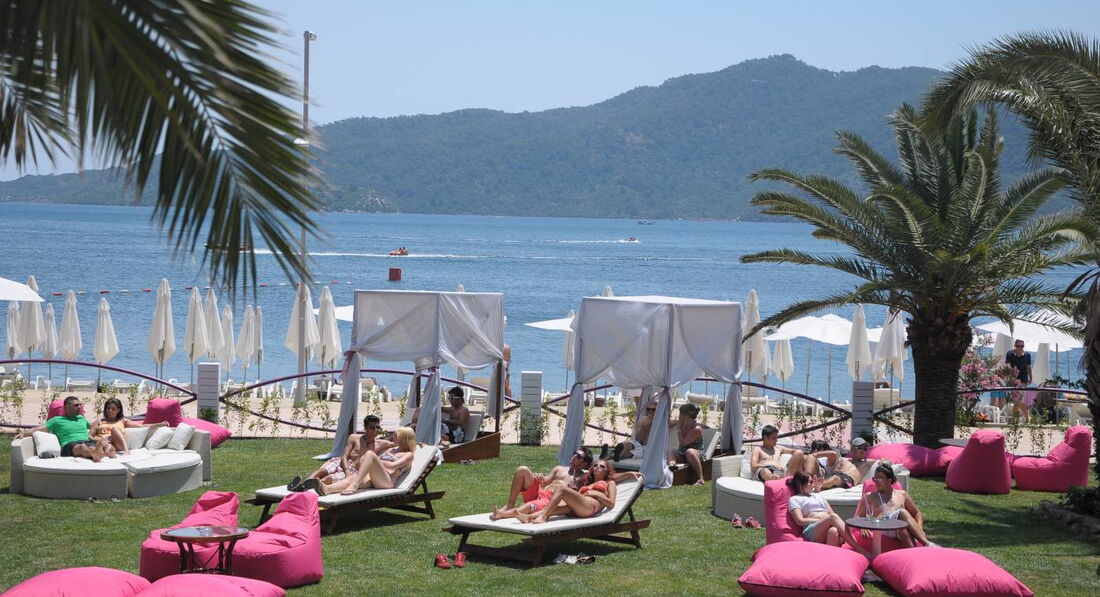 Отдыхали в Мармарисе в пятый раз, это третий отель. На наш взгляд лучший. Администрация не разделяет гостей по национальнастям, ко всем отношение одинаково доброжелательное. Возможно несколько больше внимание туркам, которые приезжают в отель на выходные, но турки все представительные. В номере все без замечаний, уборка и замена полотенец ежедневно и качественно не зависимо от чаевых, ежедневно в холодильник докладывается две бутылки воды и два сока (200 мл), чай и кофе. Питание на пять баллов, каждый найдет себе по вкусу. Фрукты в избилии и отличного качества, на завтрак, обед и ужин постояно: арбуз, дыня, яблоки, персики, нектарин, два вида винограда, слива. На обед и ужин горячее и напитки подают официанты, всегда выбор из трех горячих (мясо (настоящее, очень вкусное, всегда филе), курица и рыба (филе или целиком), на гарнир рис, макароны, кортофель и тушоные овощи, заказывать можете хоть все блюда сразу и в хоть по две порции на человека, ограничений нет. Официанты работают супер быстро, от заказа до подачи блюд 1-2 минуты, посуда все ресторанная, включая напитки. Пляж - отдельная тема. Напитки на пляже тоже подаются официантами, заказывать можно все тоже, что и на ужине, вино, пиво, 5 видов коктелей, крепкие напитки и безалгогольные, все напитки тоже подаются в стекле.