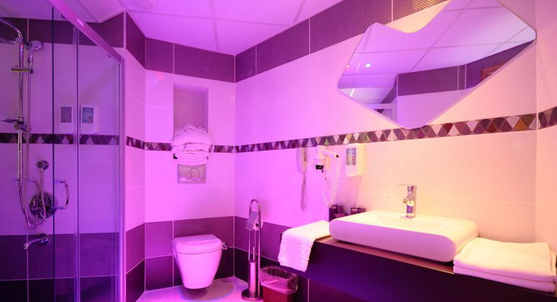 1. Ванная: такого я не видела даже в видавших виды совковых общежитиях. Свет - 2 маленьких потолочных лампочки: красная и синяя создают галлюциногенный эффект. Дополнительно включается еще одна маленькая лампочка над раковиной по принципу "дерни за веревочку". Даже если включить все три, все равно света категорически недостаточно (полумрак, как в сельской бане). Плохо вымытая сантехника. Грязный потолок, с которого периодически начинала капать вода и сыпаться штукатурка из-под плитки (на рецепшен разводили руками: мы не можем решить эту проблему). После 10 вечера регулярно пропадала горячая вода, зато днем из душа периодически текла только горячая. При уборке моется только пол.