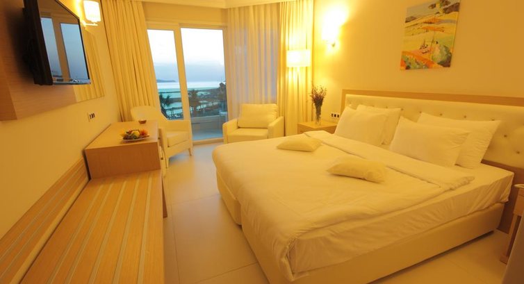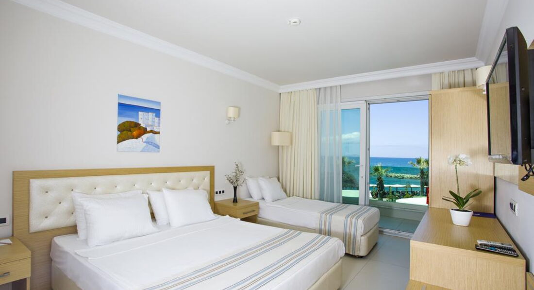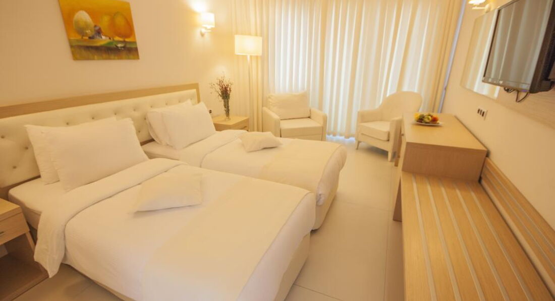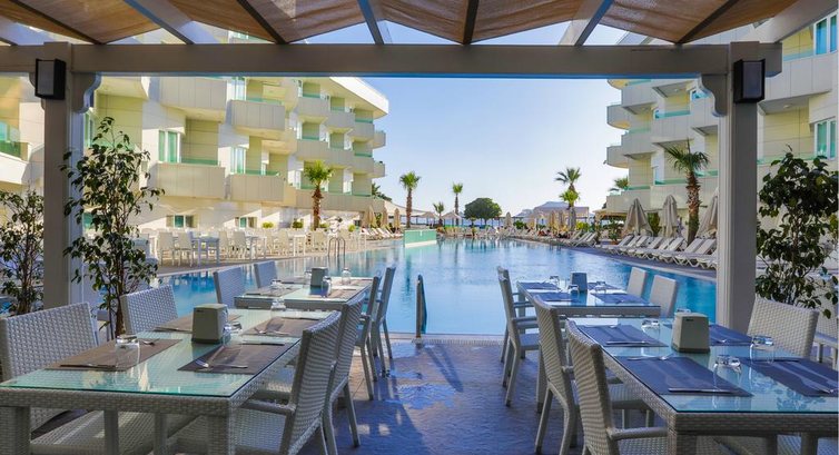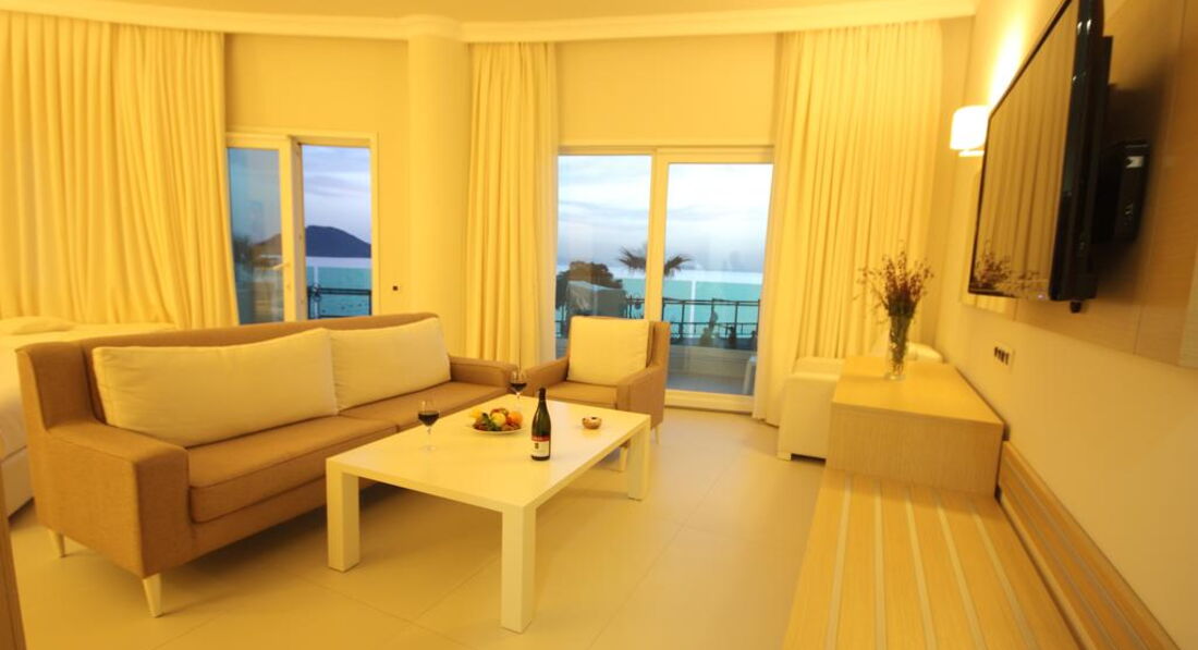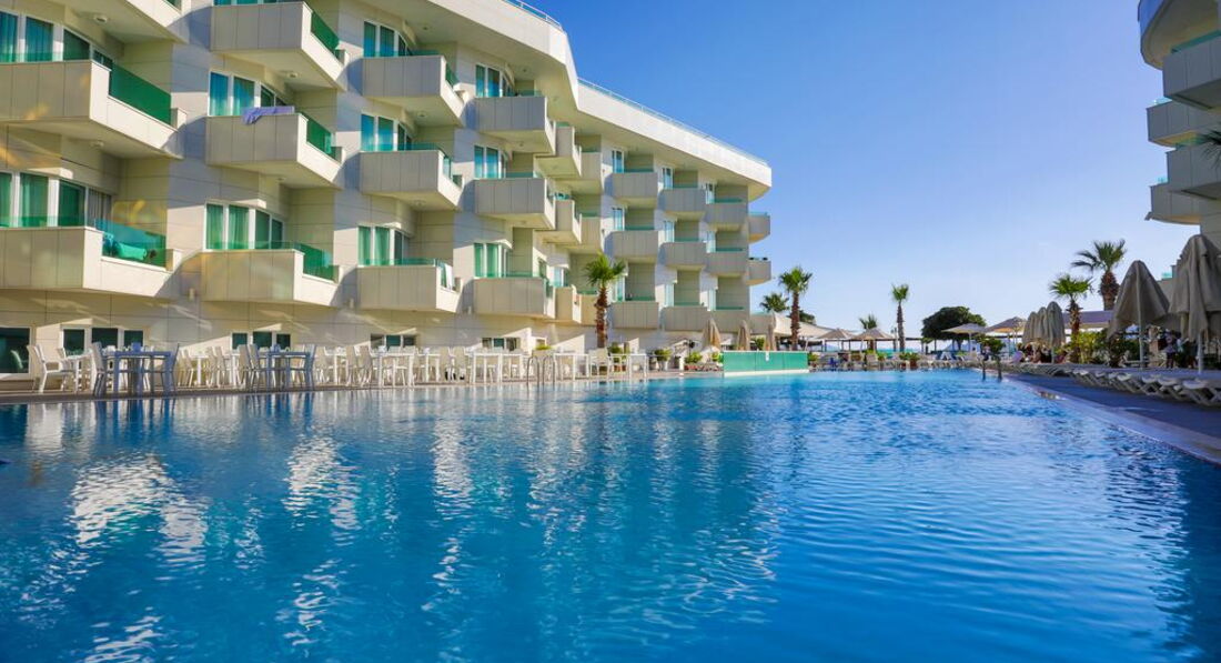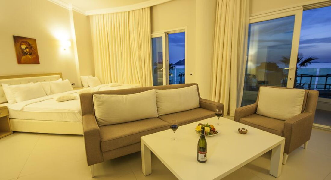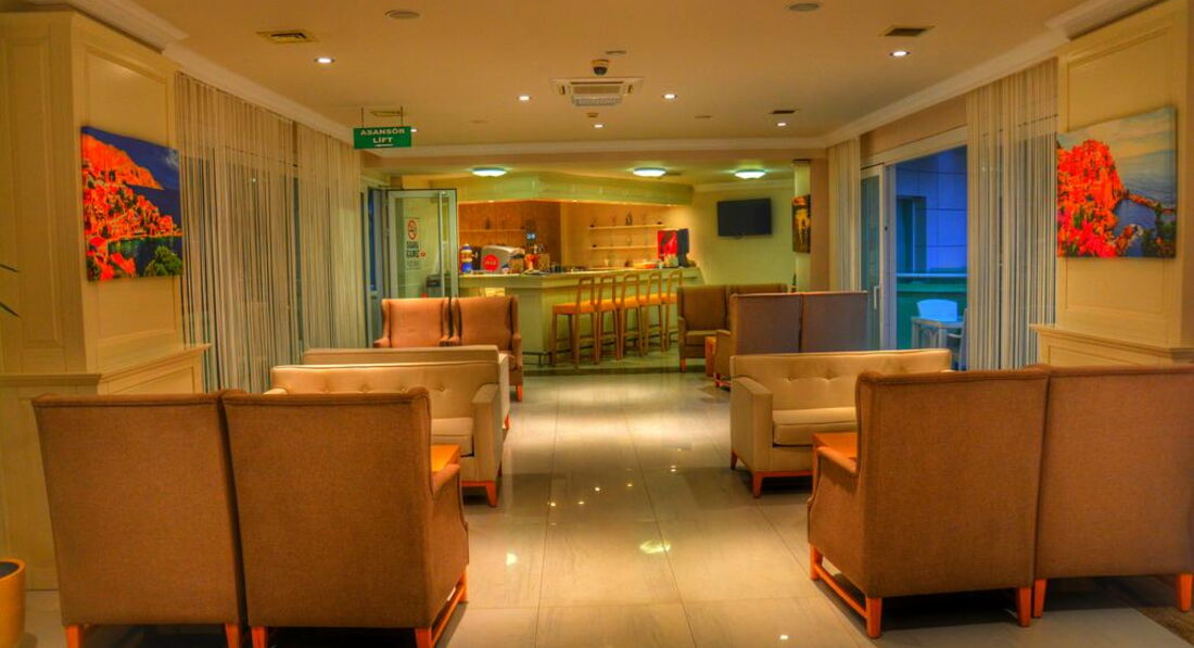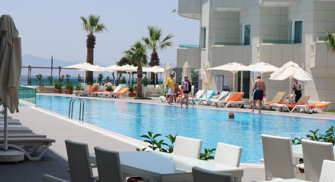 При входе в отель ощущение , что попадаешь на корабль. Все окна на море и в коридоре все окна открыты и очень свежо и солнечно. Вежливый персонал, русскоговорящих не встретила. В ресторане много официантов, работают очень быстро. Еда нормальная, без изысков. Много сладостей разнообразных. Отель был заполнен в основном турками, из иностранцев приехали в Турцию самые смелые. В течении дня постоянно что-то можно перекусить. Бассейн большой, комфортный. Лежаков много. Напротив отеля продают туры. Море через променад.. Хорошо по нему гулять- он длинный, если устали, то вдоль моря есть столики и скамейки. или доехать на такси до центра за 5 минут за 4 доллара. Такси заказать можно на ресепшене. Плюсом является близость к центру по набережной. Море чистое. Номера просторные и комфортные.