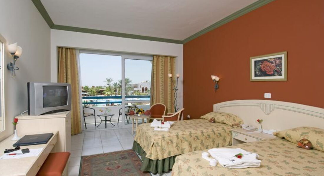 Второй этаж, вид на бассейн, чистый, просторный, все работало. Правда, было 3 полуторных кровати на 4 человека и по телефону на рецепшн мне пытались объяснить что одна из них двуспалка. Но я настояла что нужна еще одна кровать, потому что они все большие но одинаковые и никак не двуспальные, а у меня дети 150 и 180 см ростом)). Через 10 минут у нас была четвертая полноценная кровать. При четырех кроватях по номеру можно было на велике кататься. Кондиционер с индивидуальными настройками, за все время пребывания работал отлично. Фен нормальный, косметика банная имеется, холодильник холодит, в нем 1.5 литровая бутылка воды, полотенца и постели чистые. Номер устраивал абсолютно. По разным мелким вопросам в течение отдыха обращалась на рецепшн к менеджеру Mahmoud. Очень приветливый, дружелюбный, всегда старался быть полезным. На мой взгляд - самое адекватное лицо на рецепшн ( язык общения английский).