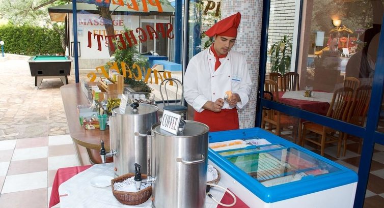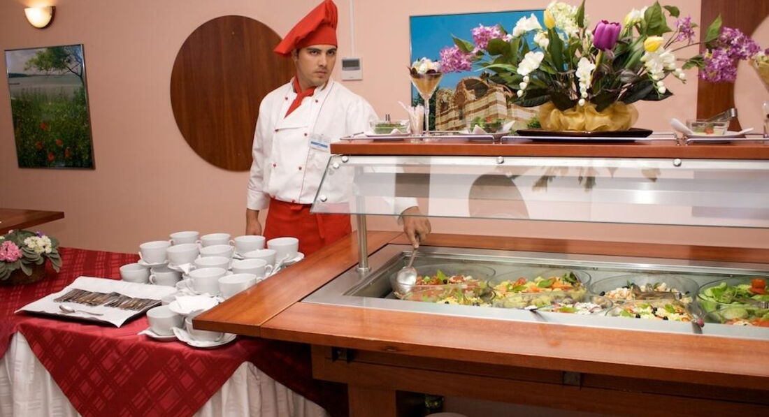 Питание очень разнообразное, всегда есть из чего выбрать, блюда доносят. Так, что если прийти под конец обеда или ужина, то голодным не останешься. Также на протяжении дня можно съесть бургер, пиццу, мороженное, а с 18.00 - рыбу и овощи на гриле. С 10.00-22.00 любые напитки: чай, кофе, соки, кола, спрайт, фанта, а также алкогольные (вино, пиво, джин, ром, виски, бренди, ликеры, водка) - болгарского производства.
